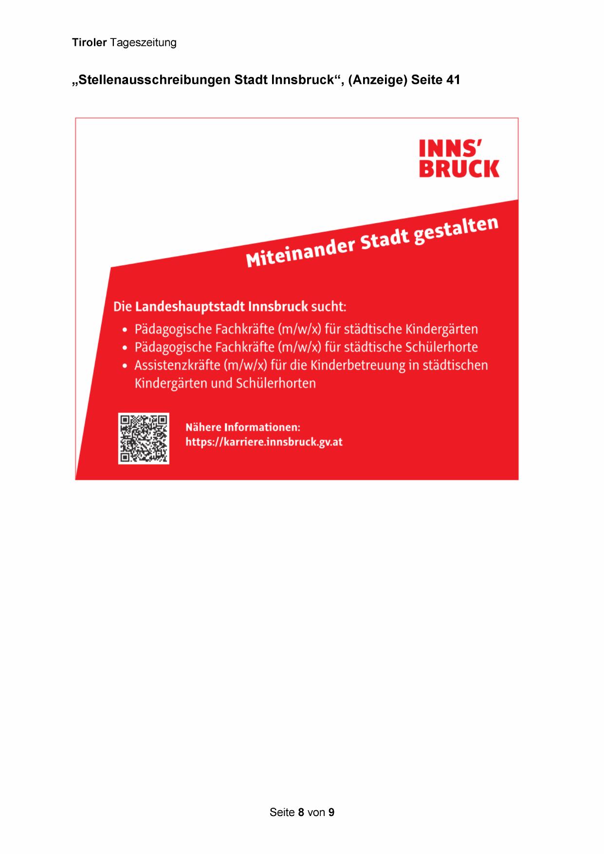 „Stellenausschreibungen Stadt Innsbruck“, (Anzeige) Seite 41
