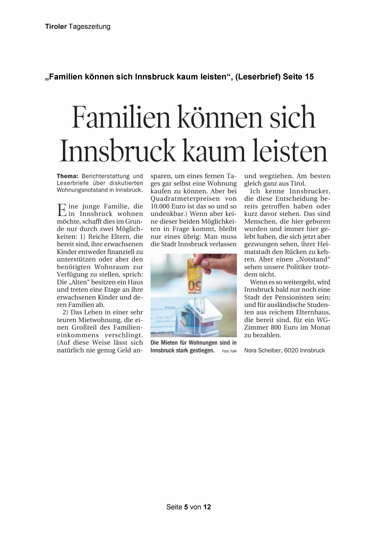 „Familien können sich Innsbruck kaum leisten“, (Leserbrief) Seite 15