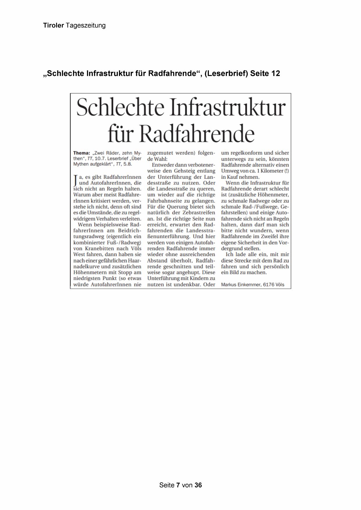 „Schlechte Infrastruktur für Radfahrende“, (Leserbrief) Seite 12