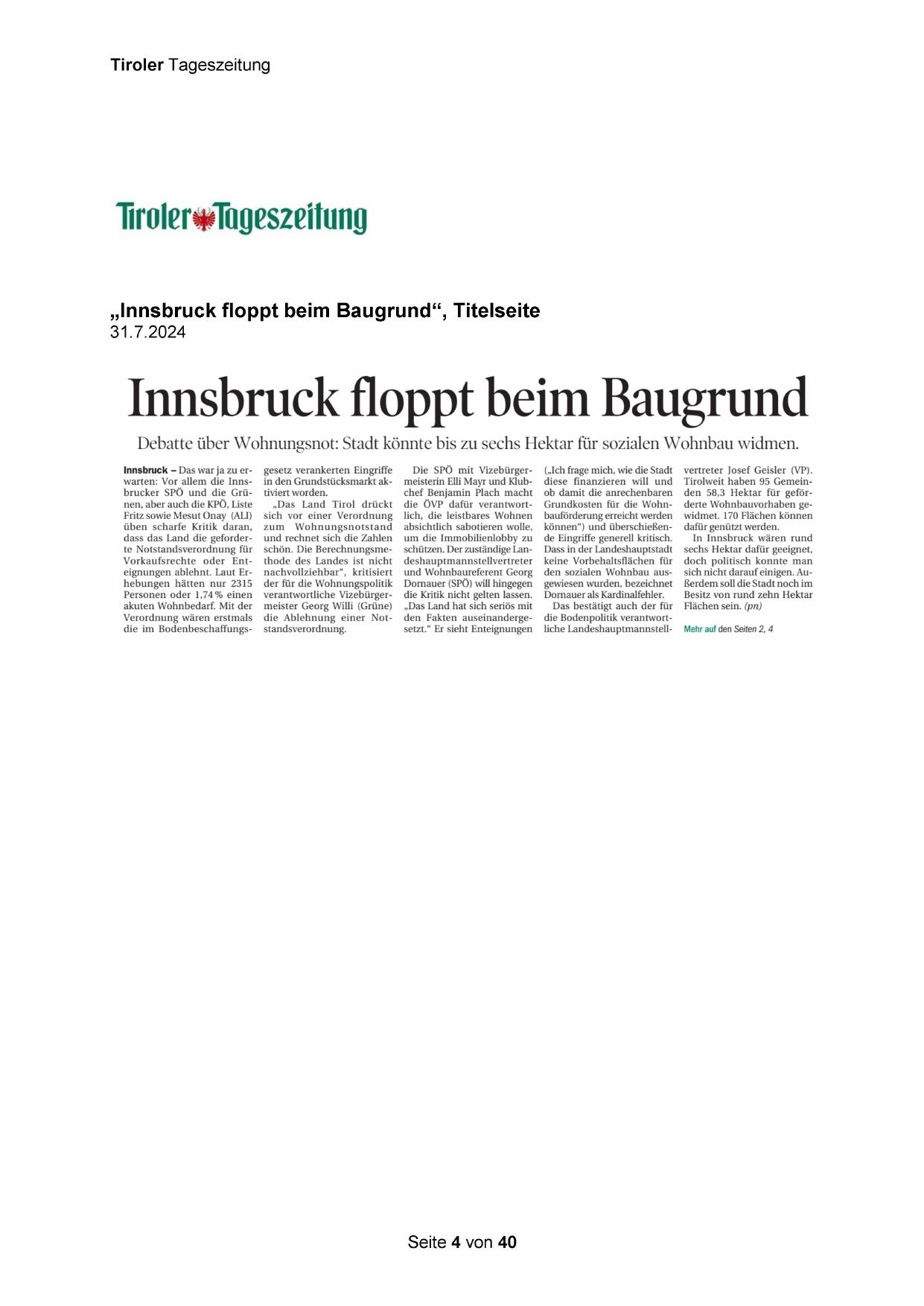 „Innsbruck floppt beim Baugrund“, Titelseite