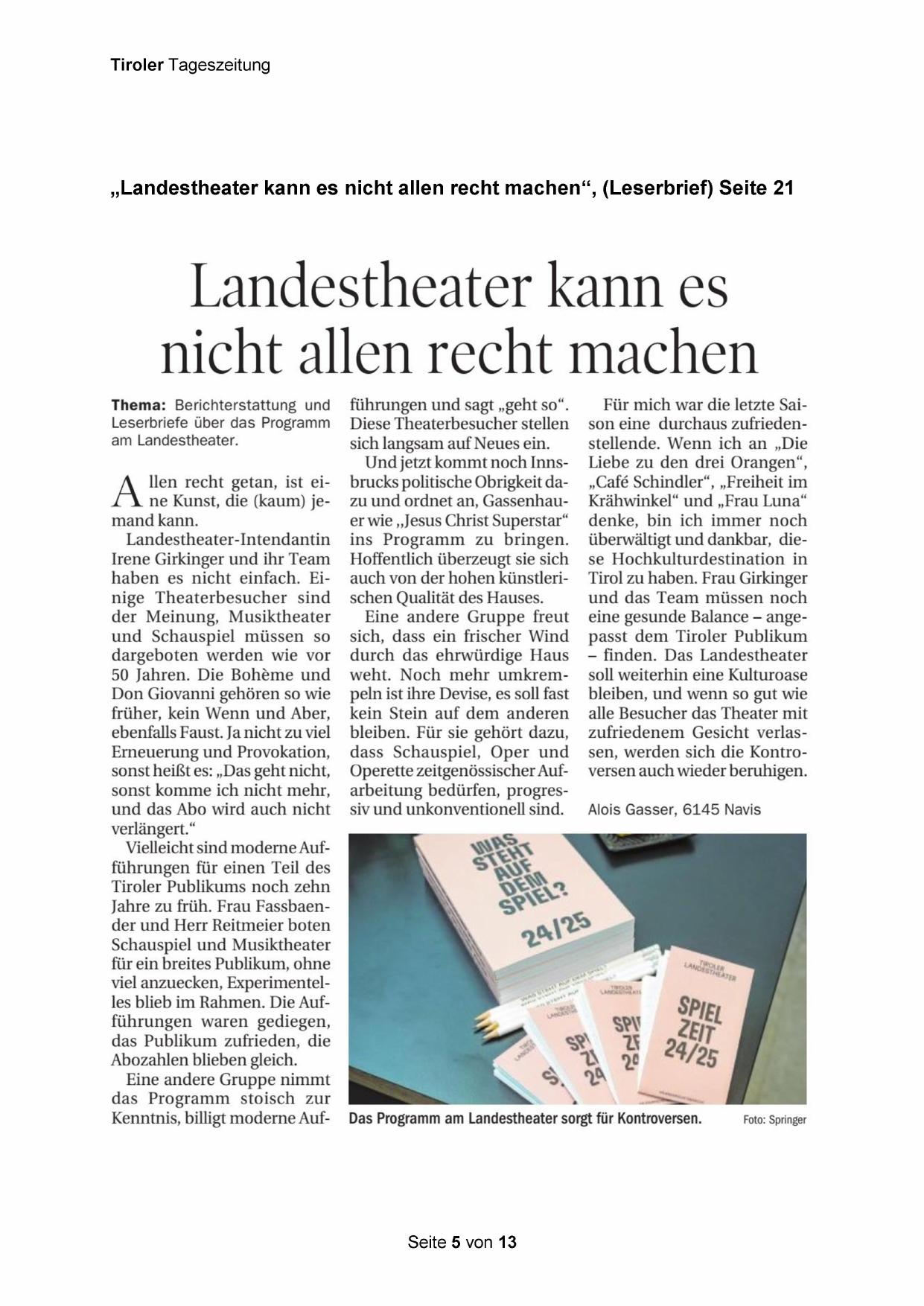 „Landestheater kann es nicht allen recht machen“, (Leserbrief) Seite 21
