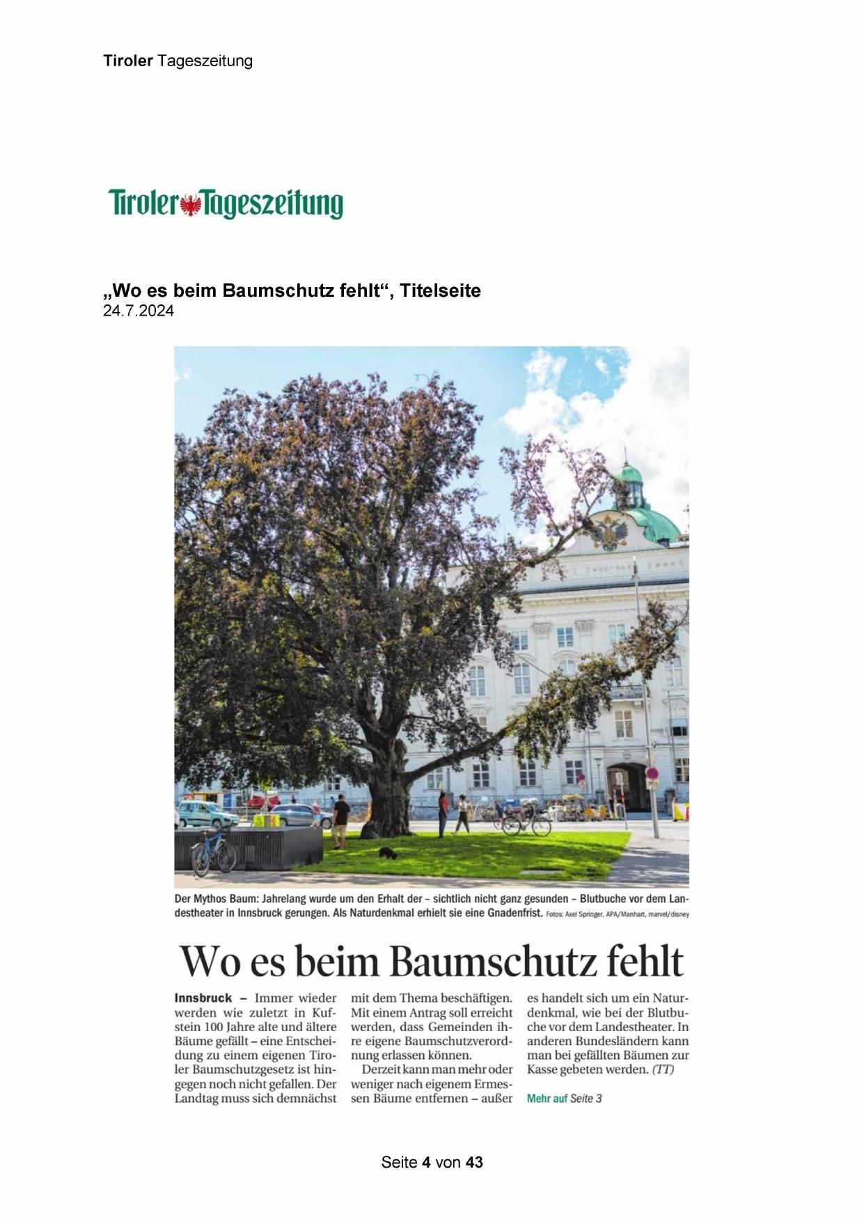 Bäume gefällt — eine Entscheidung zu einem eigenen Tiroler Baumschutzgesetz ist hingegen noch nicht gefallen. Der