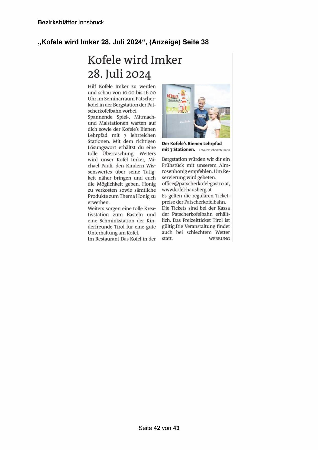 „Kofele wird Imker 28. Juli 2024*“, (Anzeige) Seite 38