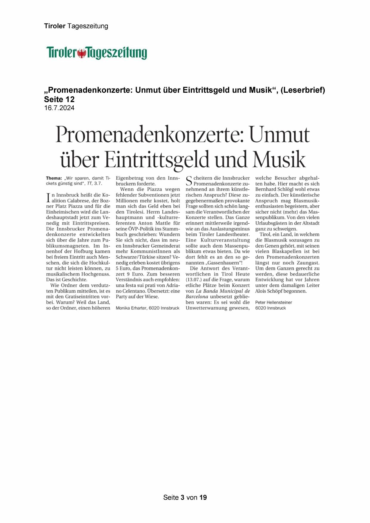 „Promenadenkonzerte: Unmut über Eintrittsgeld und Musik“, (Leserbrief)