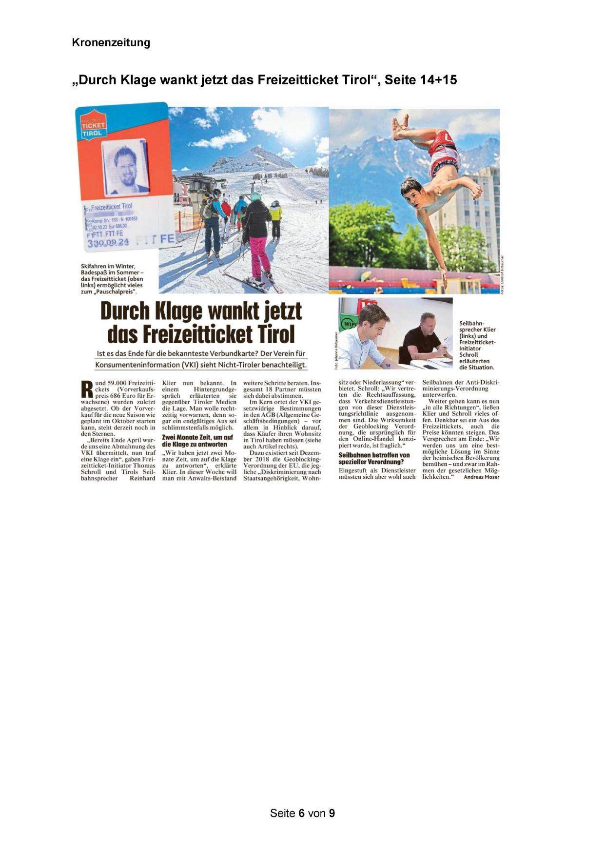 „Durch Klage wankt jetzt das Freizeitticket Tirol“, Seite 14+15