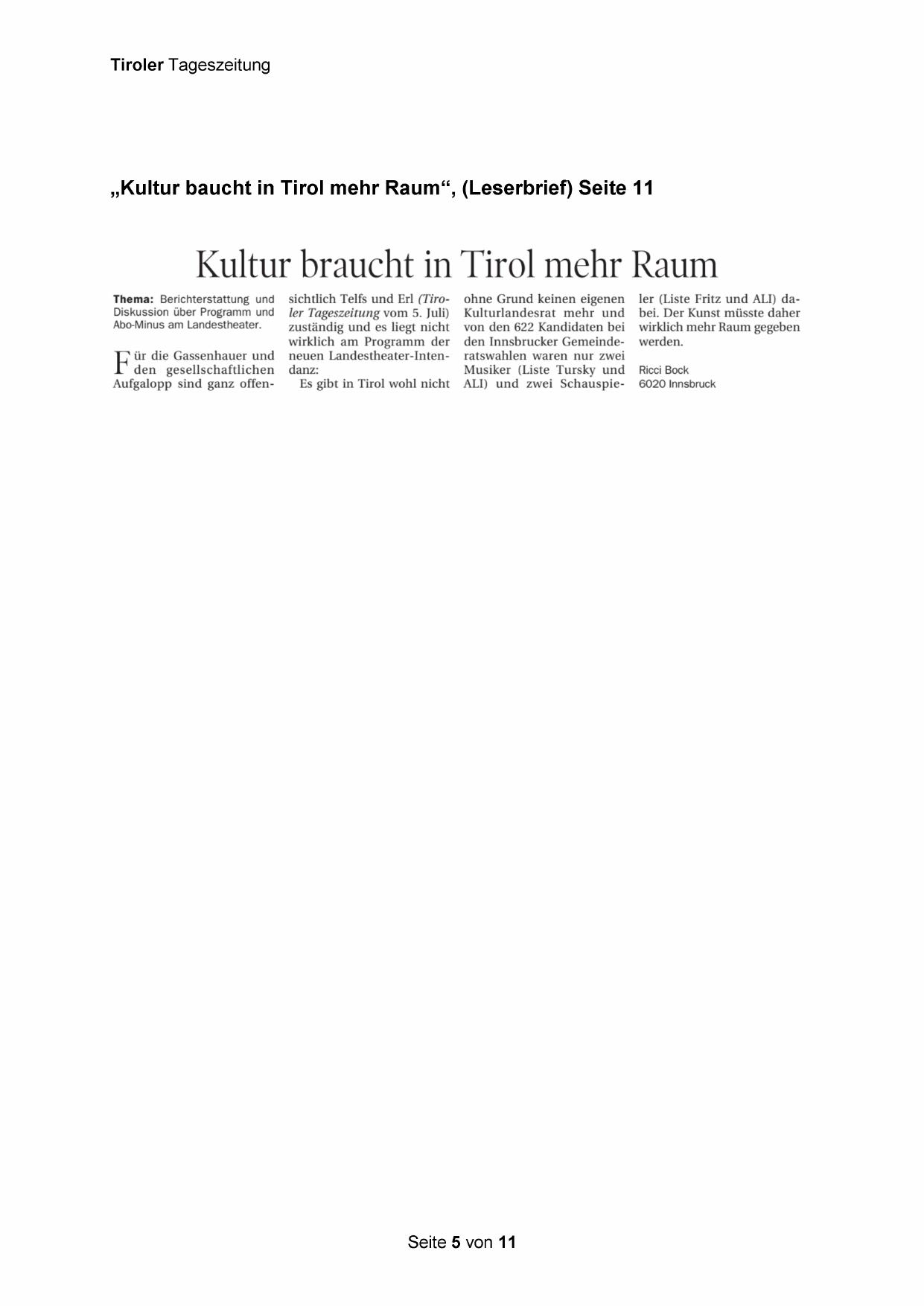 „Kultur baucht in Tirol mehr Raum“, (Leserbrief) Seite 11