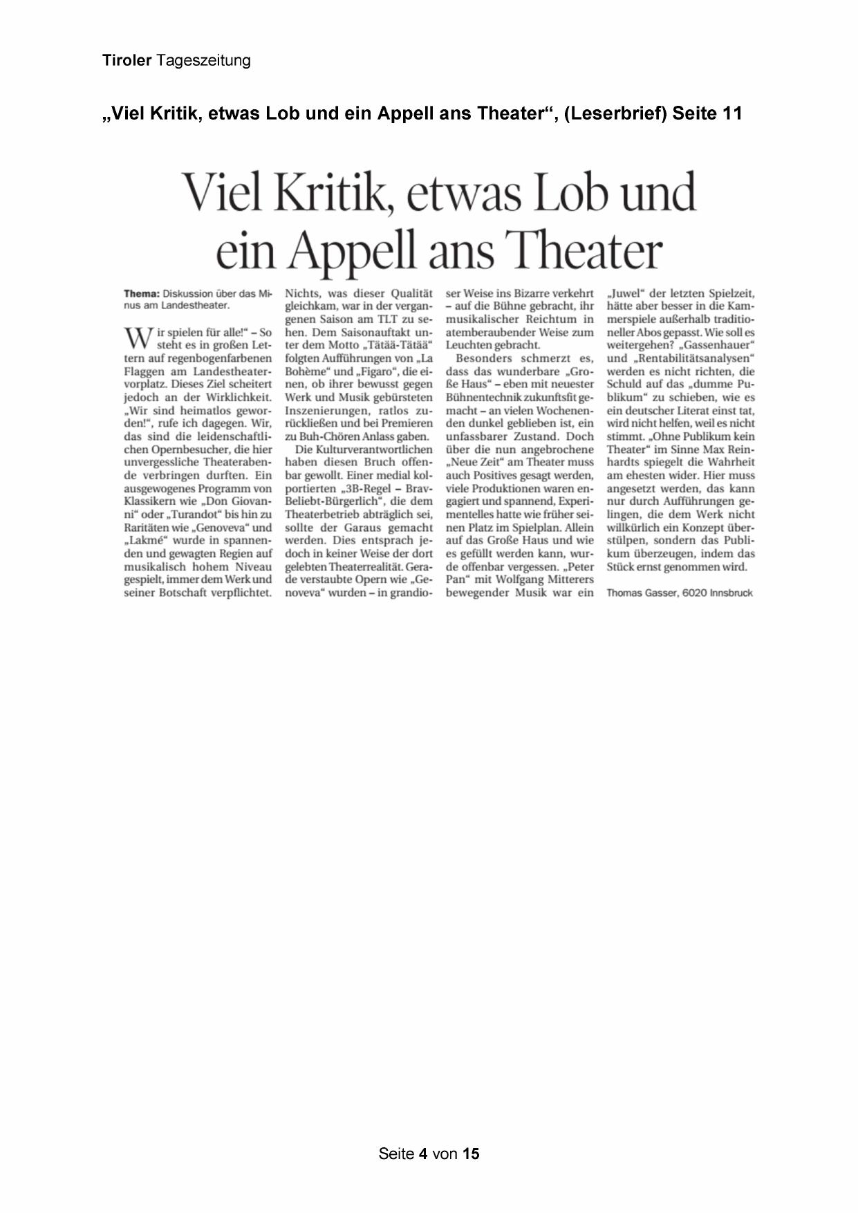 „Viel Kritik, etwas Lob und ein Appell ans Theater“, (Leserbrief) Seite 11