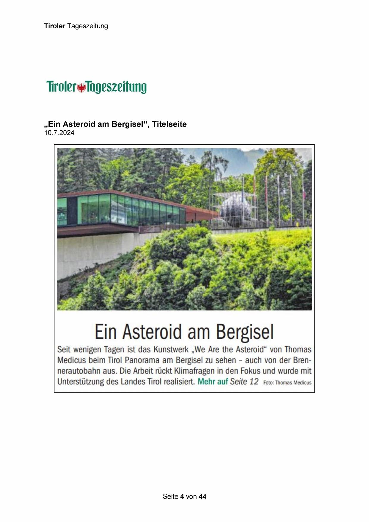 Medicus beim Tirol Panorama am Bergisel zu sehen - auch von der Brennerautobahn aus. Die Arbeit rückt Klimafragen in den Fokus und wurde mit