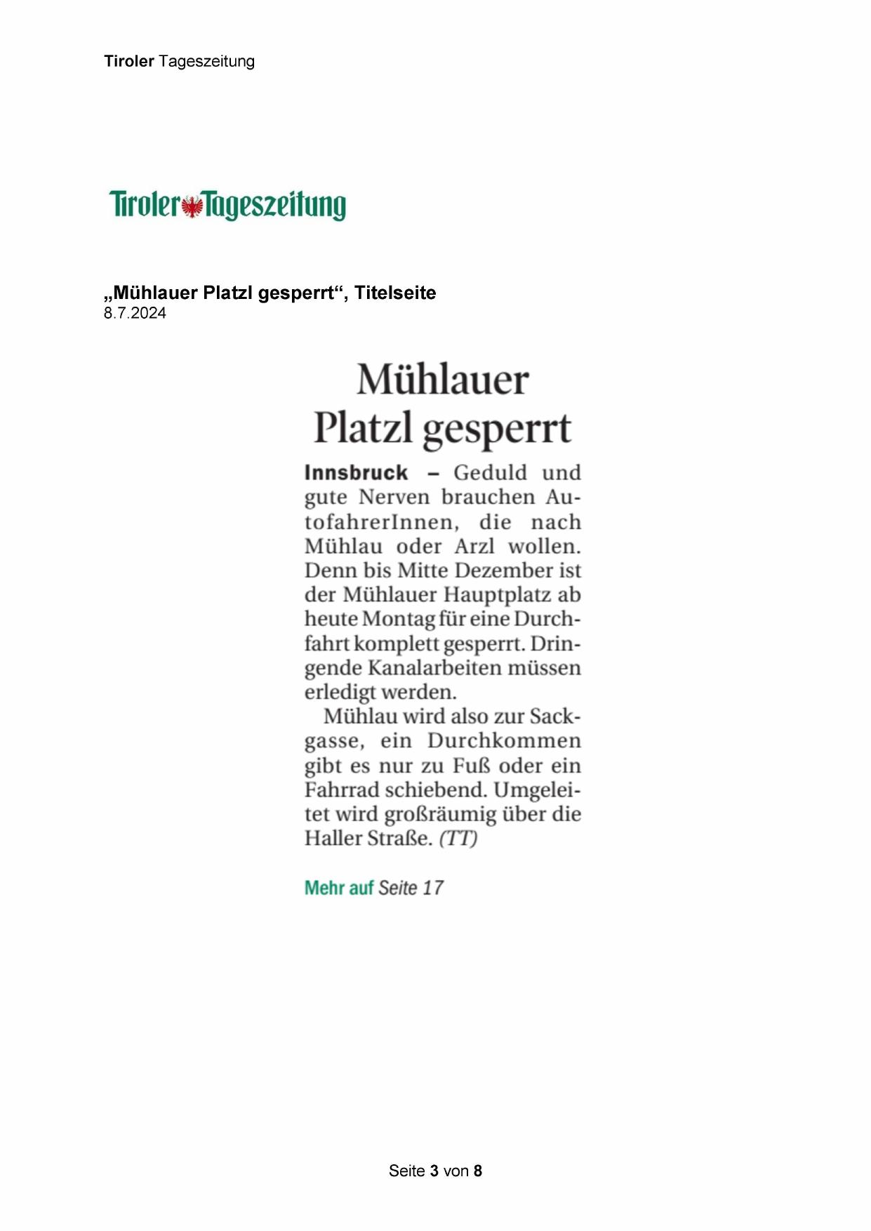 „Mühlauer Platzl gesperrt“, Titelseite