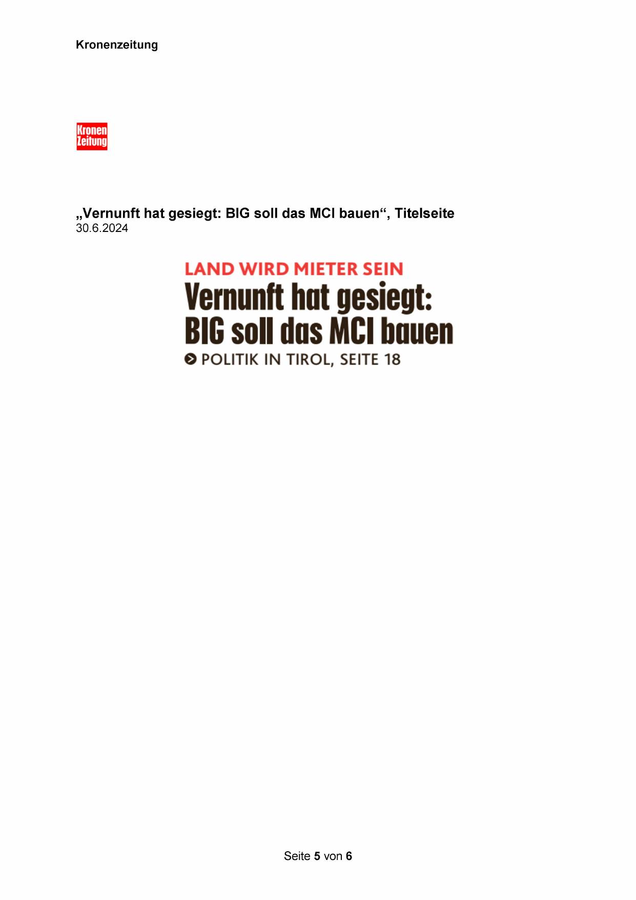 „Vernunft hat gesiegt: BIG soll das MCI bauen“, Titelseite