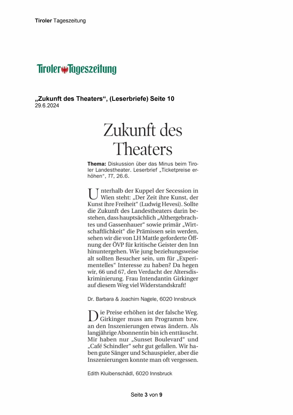 Thema: Diskussion über das Minus beim Tiroler Landestheater. Leserbrief „Ticketpreise erhöhen“, TT, 26.6.