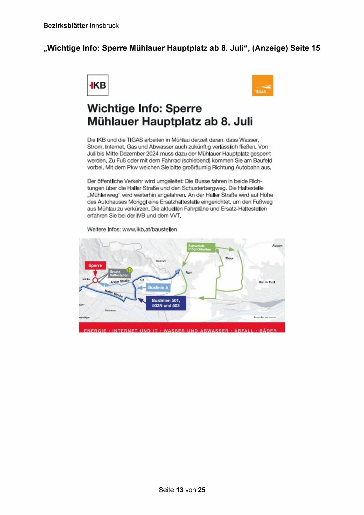 „Wichtige Info: Sperre Mühlauer Hauptplatz ab 8. Juli‘“, (Anzeige) Seite 15
