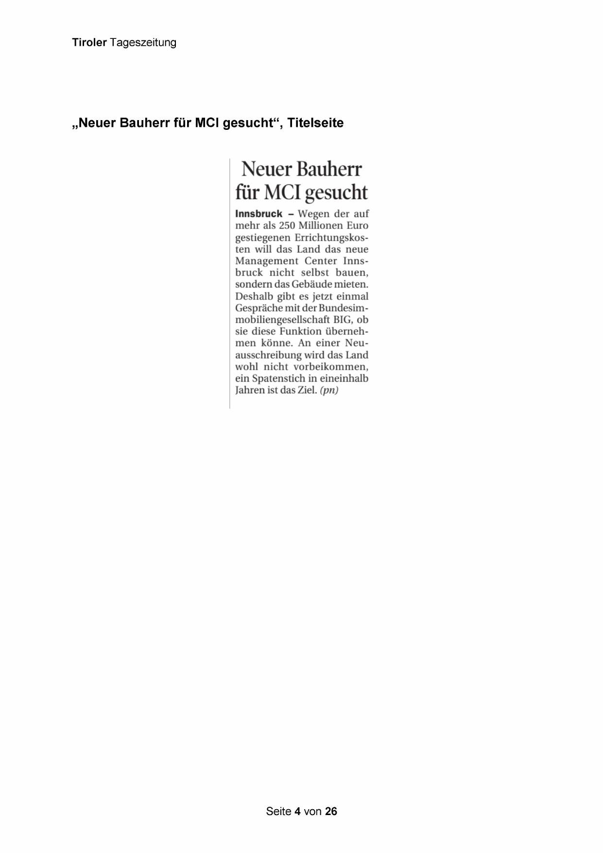 „Neuer Bauherr für MCI gesucht“, Titelseite
