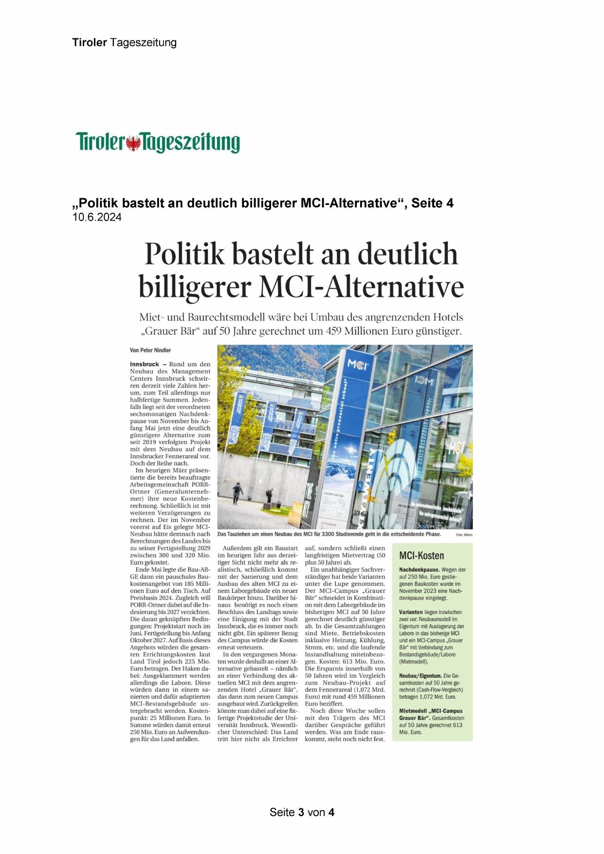 Das Tauziehen ulfu éinen Neubau des MCI für 3300 Studierende geht in die ents£heidende Phase.
