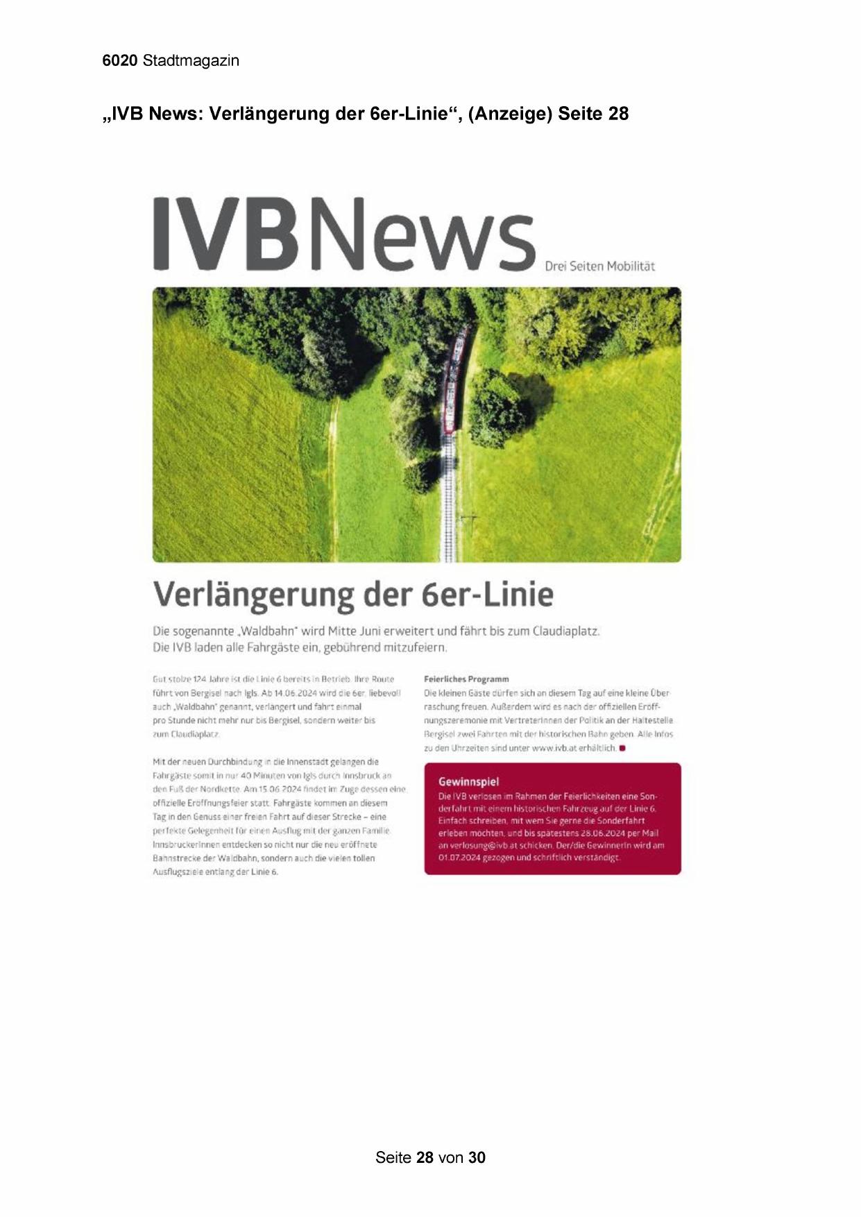 „IVB News: Verlängerung der 6er-Linie“, (Anzeige) Seite 28