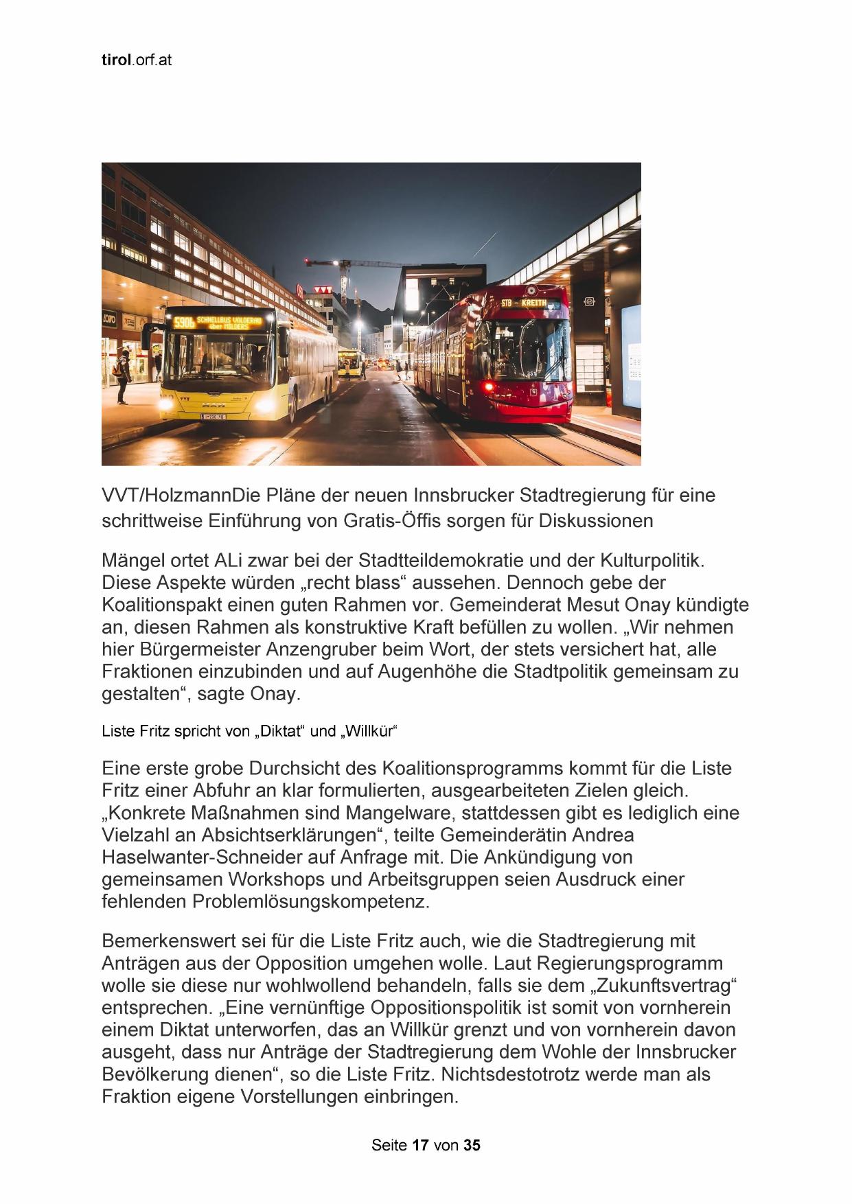 Bemerkenswert sei für die Liste Fritz auch, wie die Stadtregierung mit