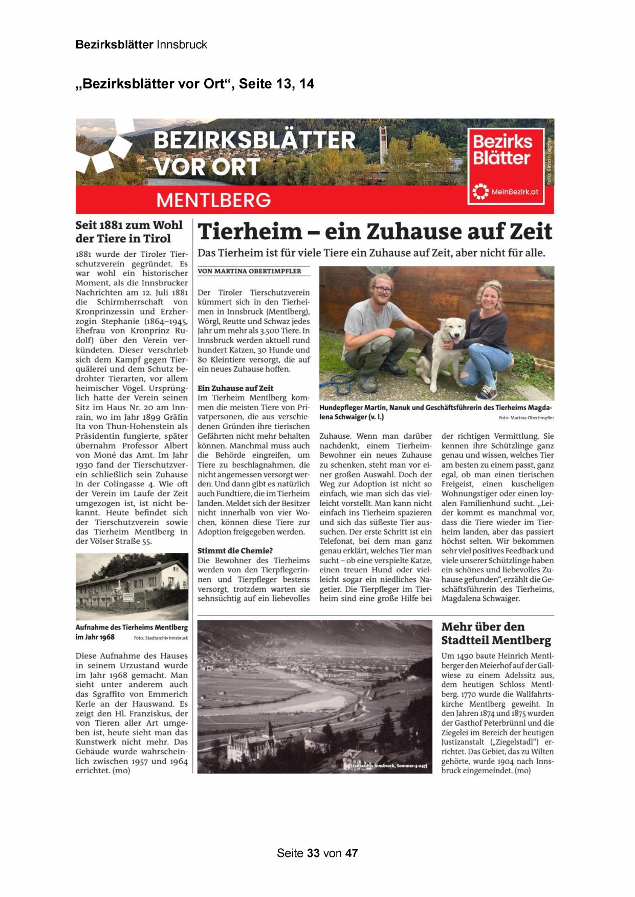 kümmert sich in den Tierheimen in Innsbruck (Mentlberg),