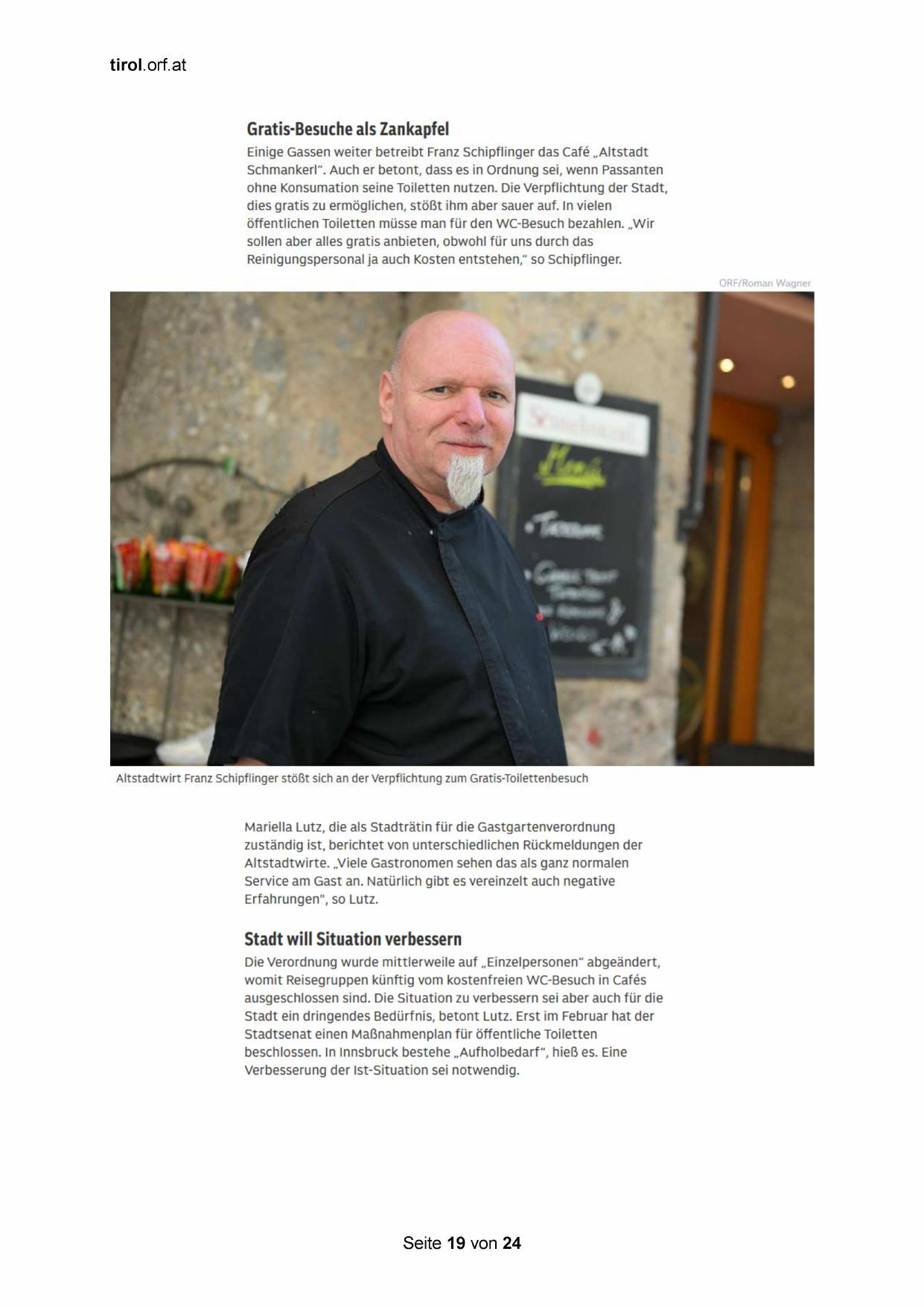 Altstadtwirt Franz Schipflinger stößt sich an der Verpflichtung zum Gratis-Toilettenbesuch