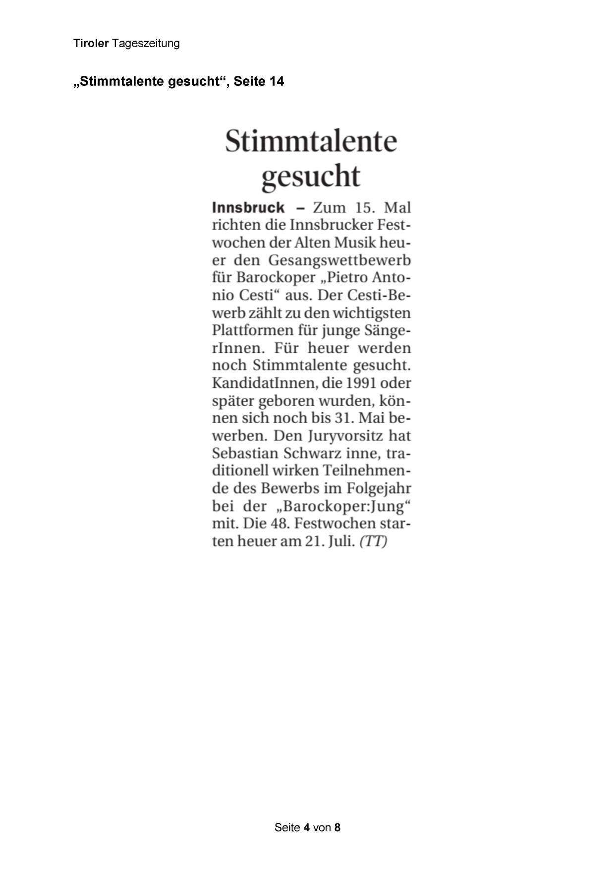 für Barockoper „Pietro Antonio Cesti“ aus. Der Cesti-Bewerb zählt zu den wichtigsten