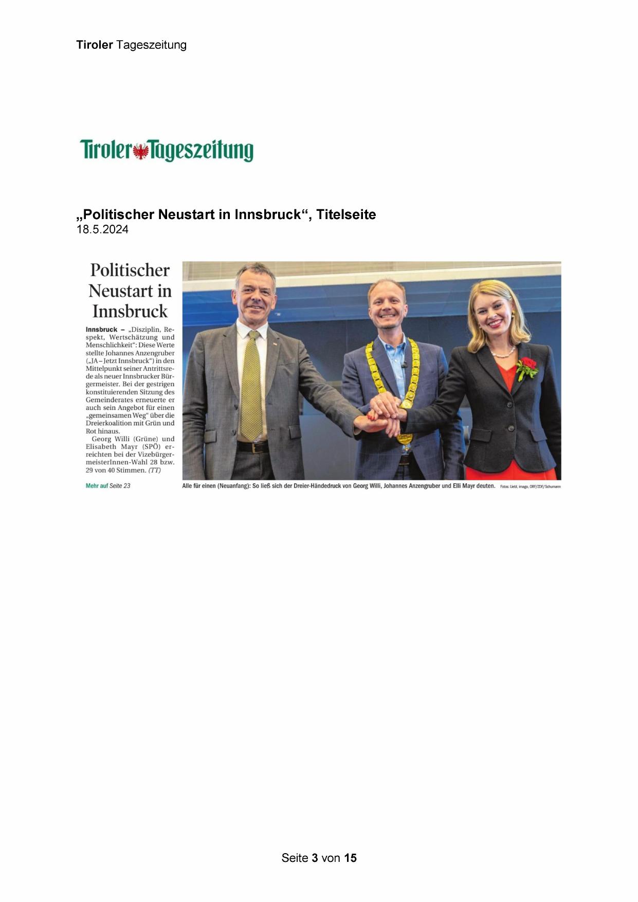 „Politischer Neustart in Innsbruck“, Titelseite
