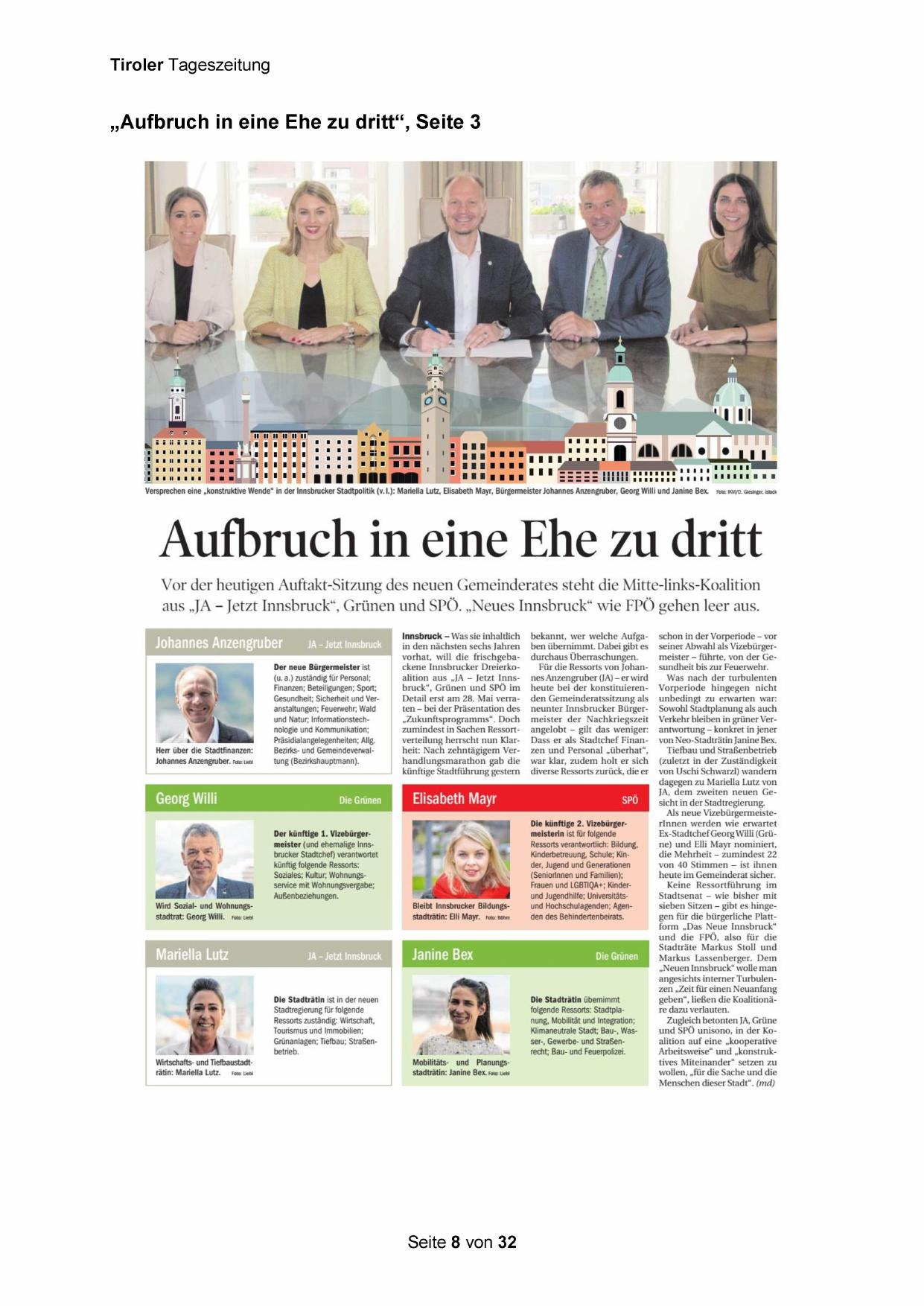 aus „JA - Jetzt Innsbruck“, Grünen und SPOÖ. „Neues Innsbruck“ wie FPÖ gehen leer aus.