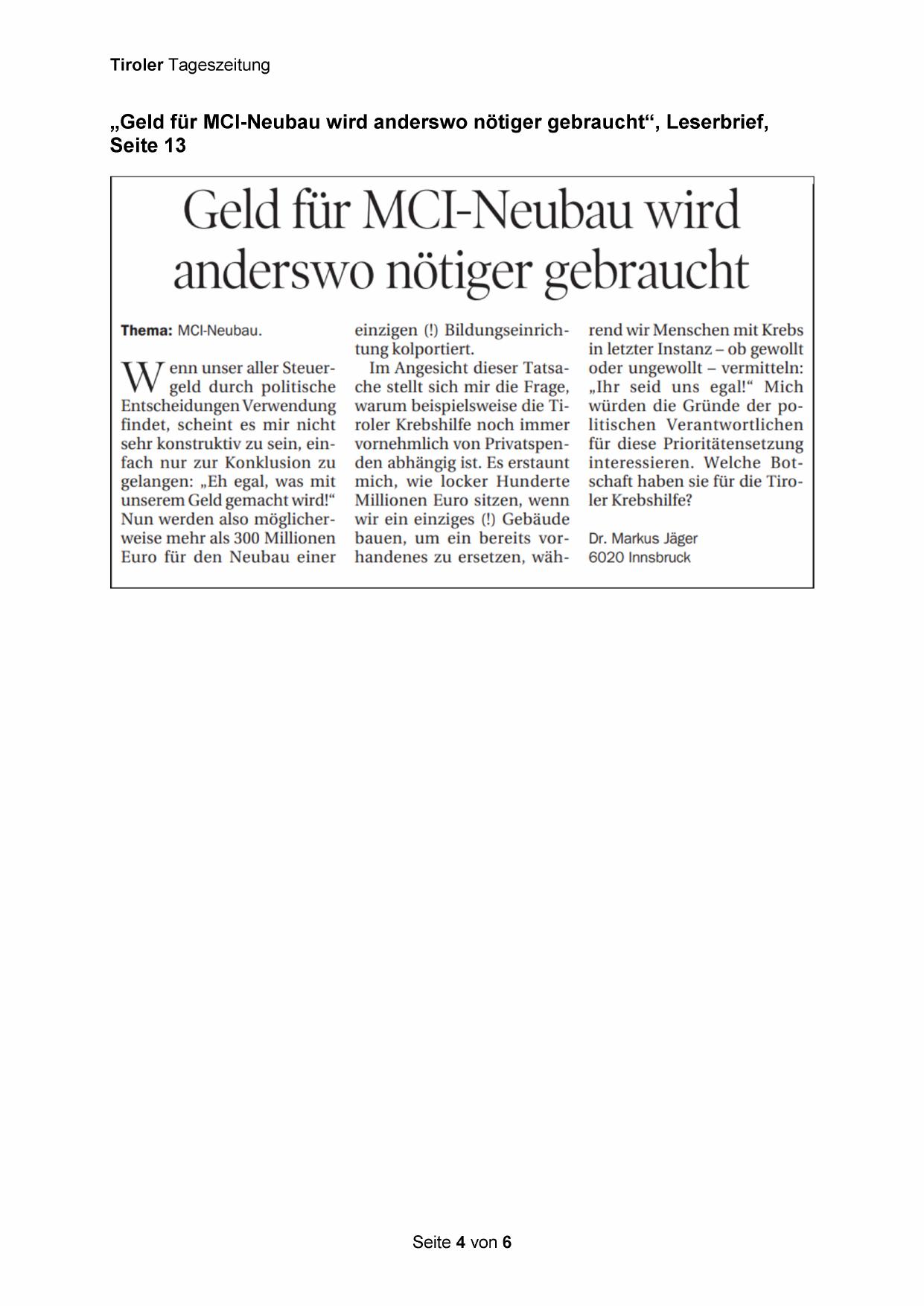 „Geld für MCI-Neubau wird anderswo nötiger gebraucht“, Leserbrief,