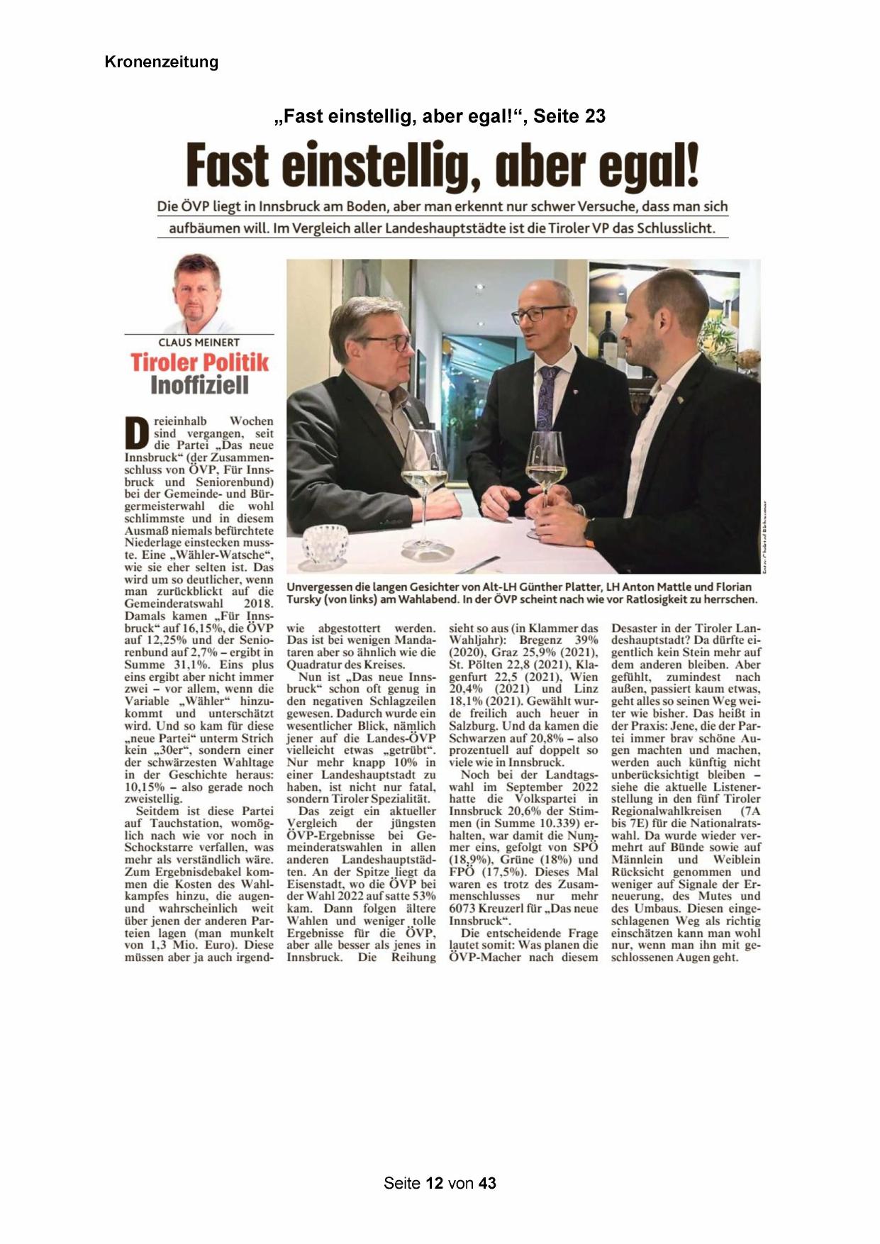aufbäumen will. Im Vergleich aller Landeshauptstädte ist die Tiroler VP das Schlusslicht.