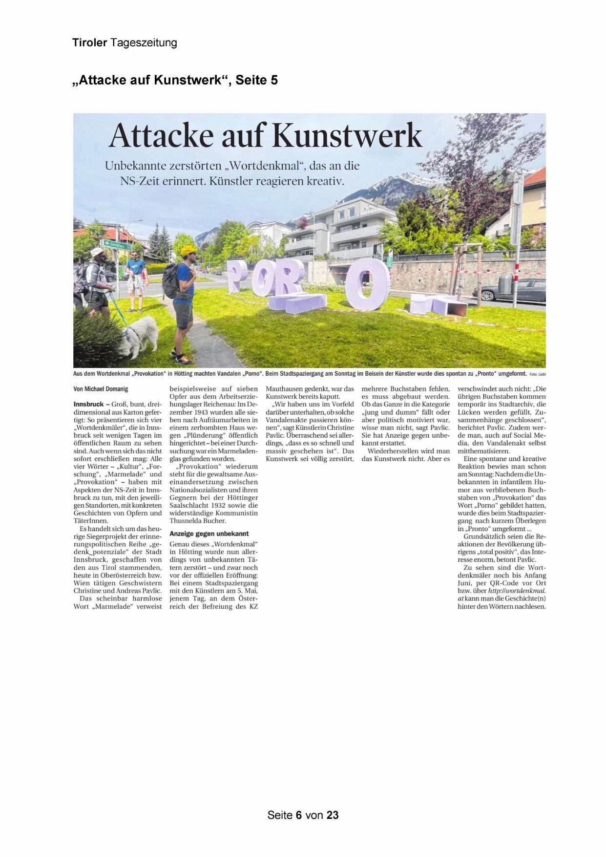 Aus dem Wortdenkmal „Provokation“ in Hötting machten Vandalen „Porno“. Beim Stadtspaziergang am Sonntag im Beisein der Künstler wurde dies spontan zu „Pronto“ umgeformt. Foto: Lieb!