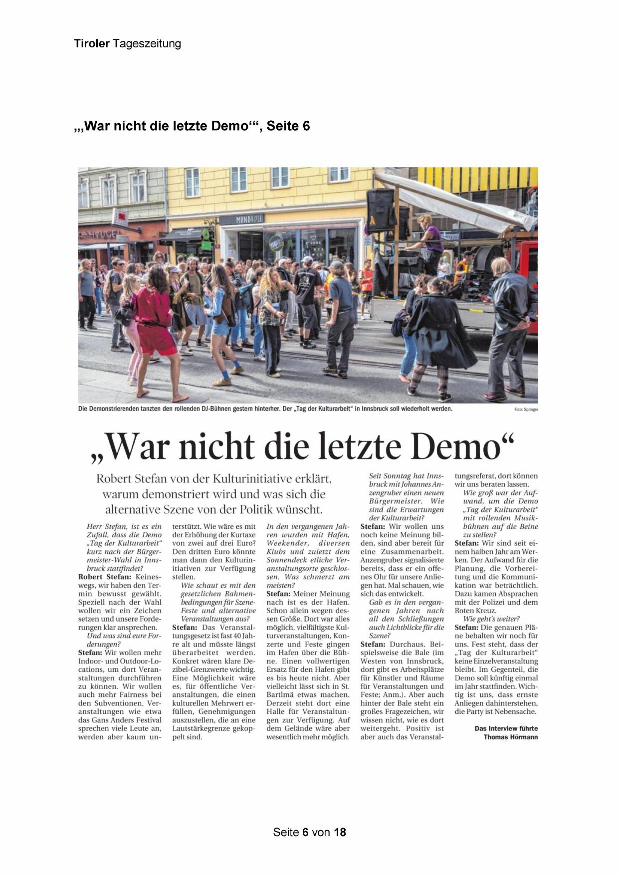 Die Demonstnerenden tanzten den rollenden DJ-Bühnen gestern hinterher. Der „Tag der Kulturarbent“ in lnnsbruck soll mederholt werden.