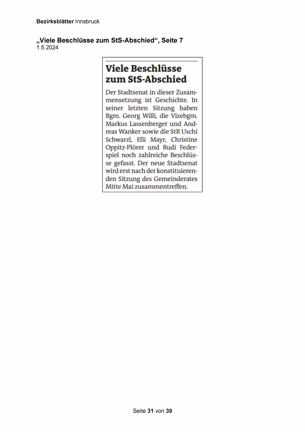 Oppitz-Plörer und Rudi Federspiel noch zahlreiche Beschlüsse gefasst. Der neue Stadtsenat