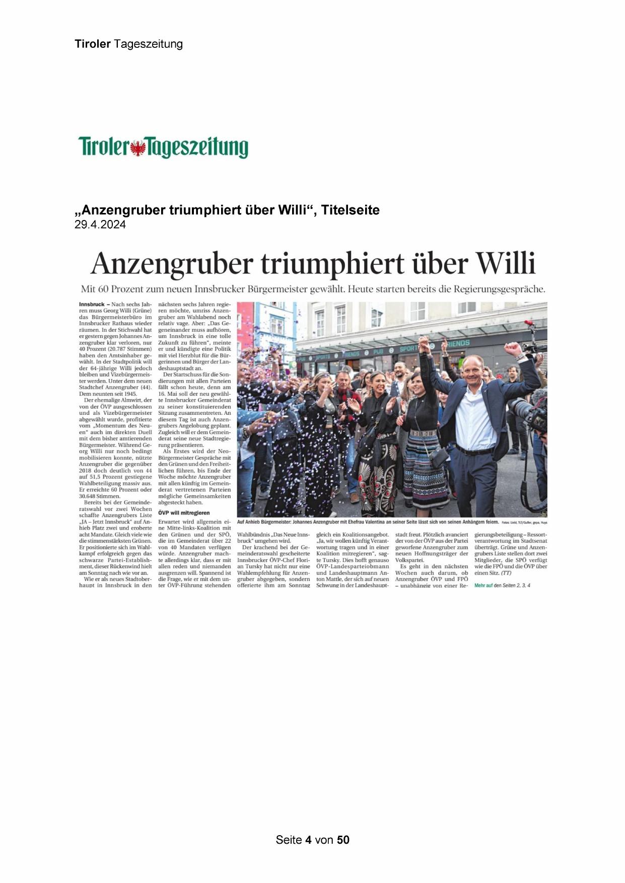 „Anzengruber triumphiert über Willi“, Titelseite