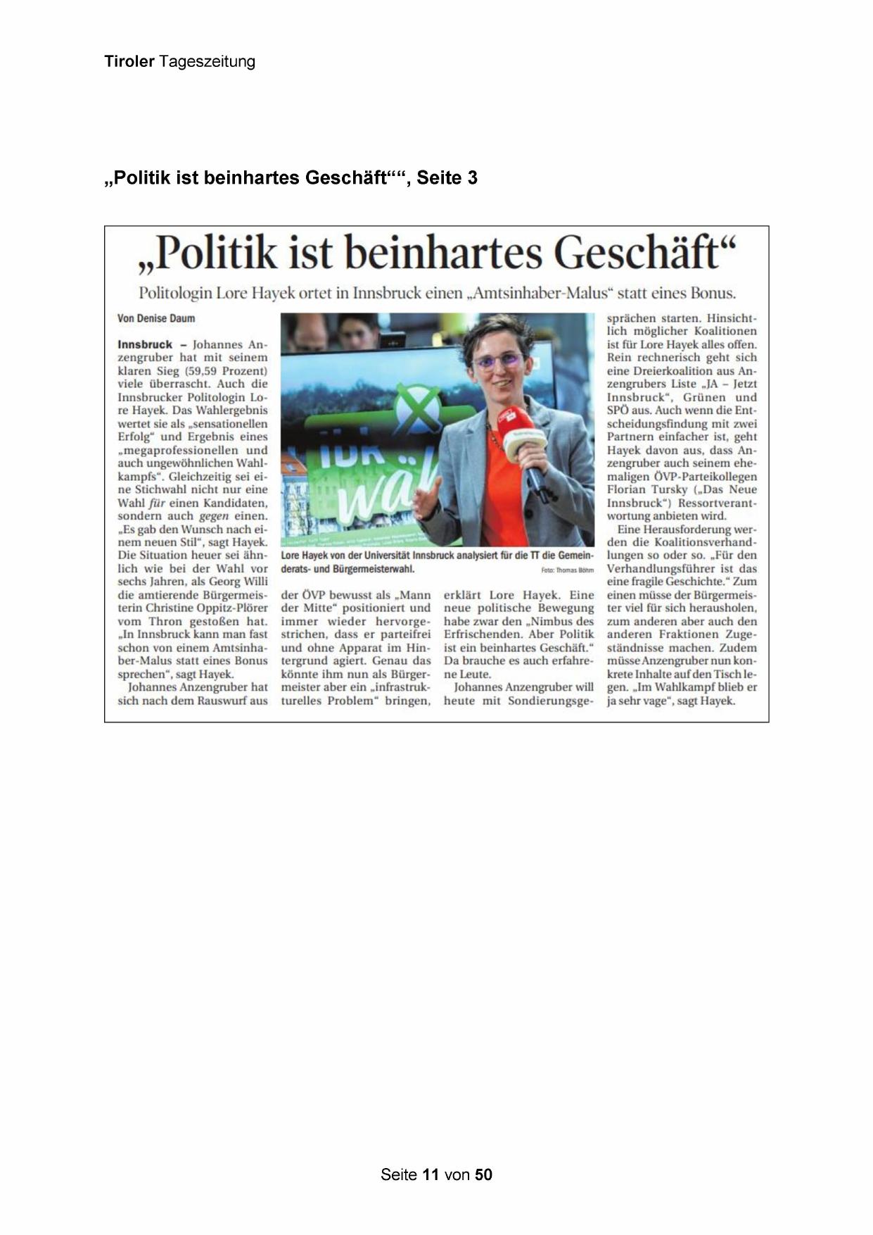 Innsbrucker Politologin Lore Hayek. Das Wahlergebnis