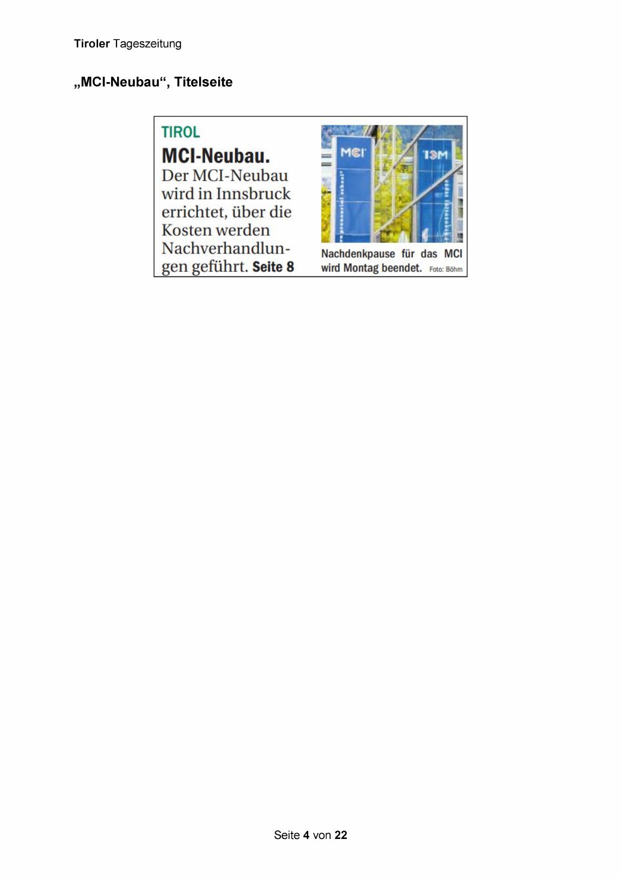 „MCI-Neubau“, Titelseite