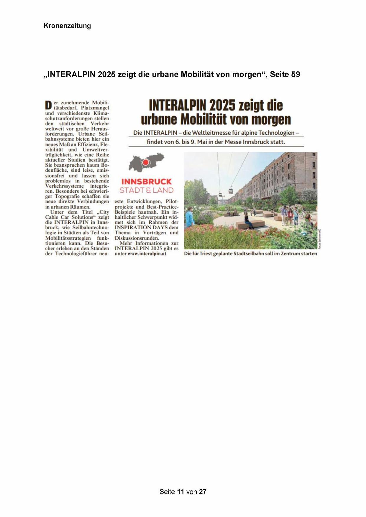 die INTERALPIN in Innsbruck, wie Seilbahntechnologie in Städten als Teil von