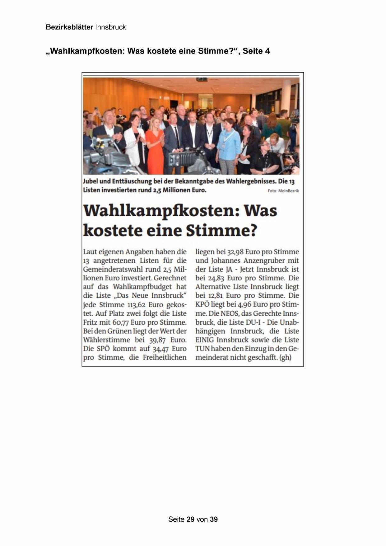KPÖ liegt bei 4,96 Euro pro Stimme. Die NEOS, das Gerechte Innsbruck, die Liste DU-I - Die Unabhängigen Innsbruck, die Liste
