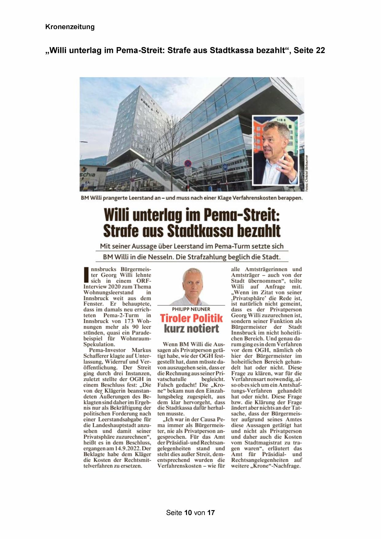 „Willi unterlag im Pema-Streit: Strafe aus Stadtkassa bezahlt“, Seite 22