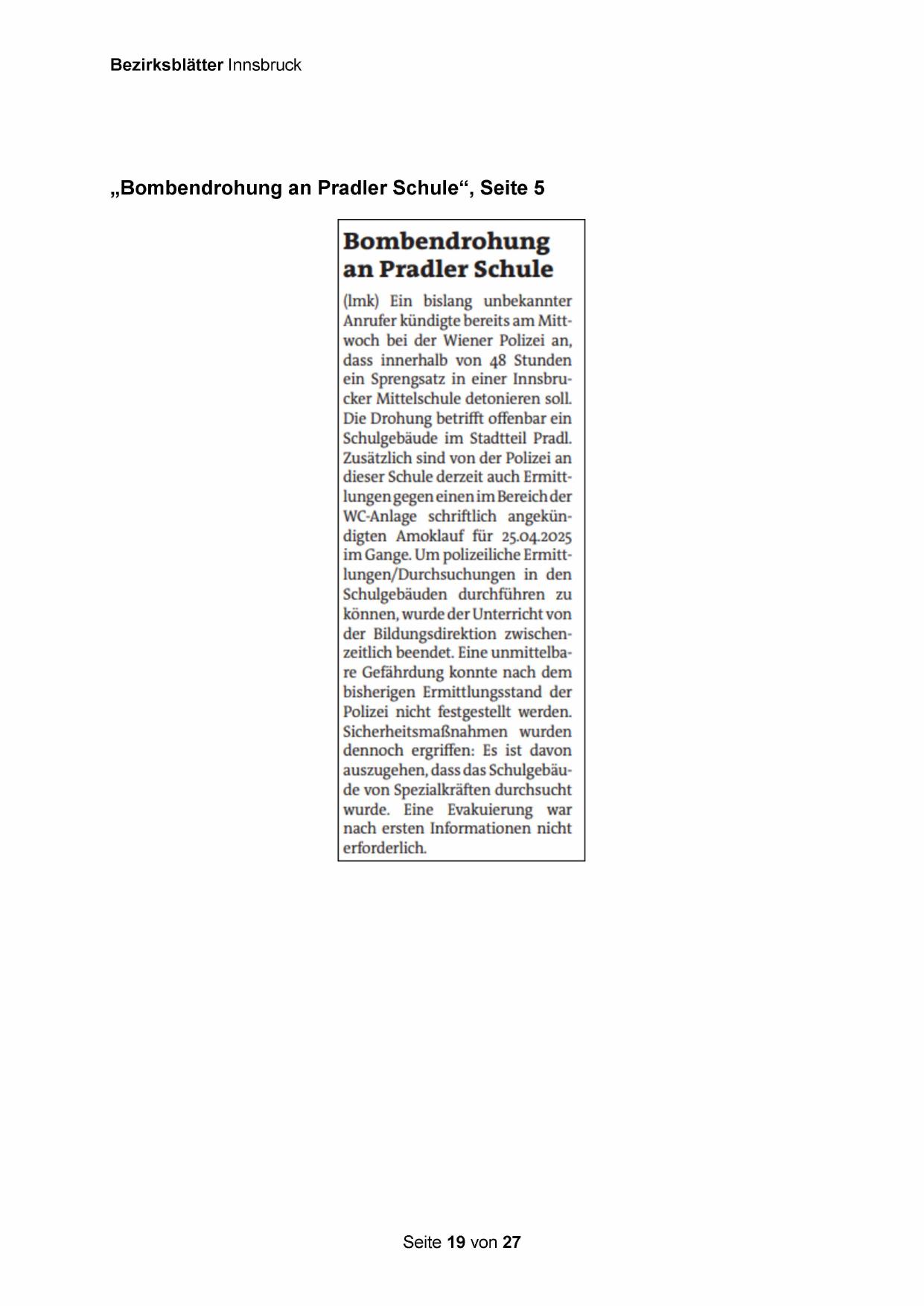 ein Sprengsatz in einer Innsbrucker Mittelschule detonieren soll.