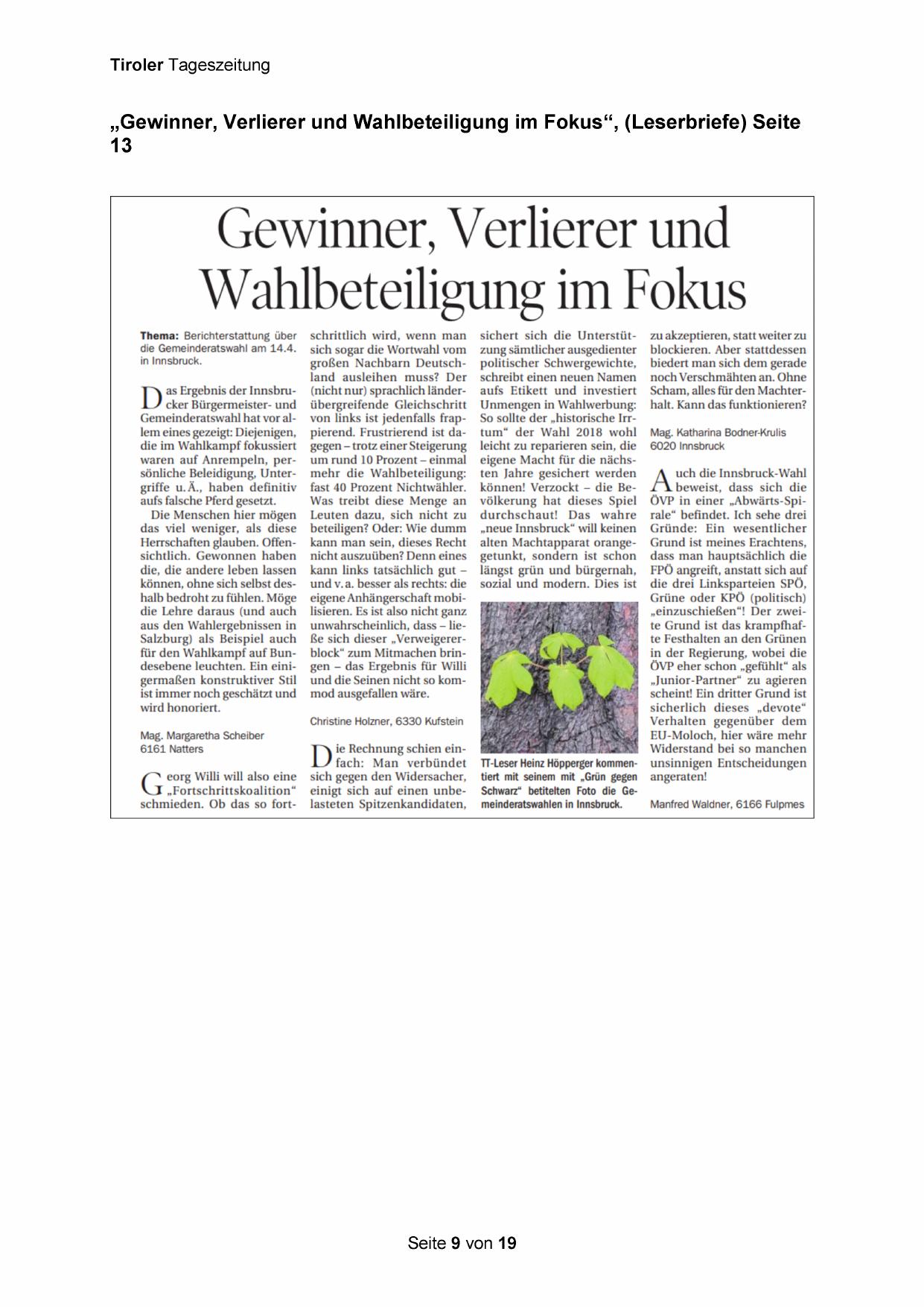 TT-Leser Heinz Höpperger kommentiert mit seinem mit „Grün gegen