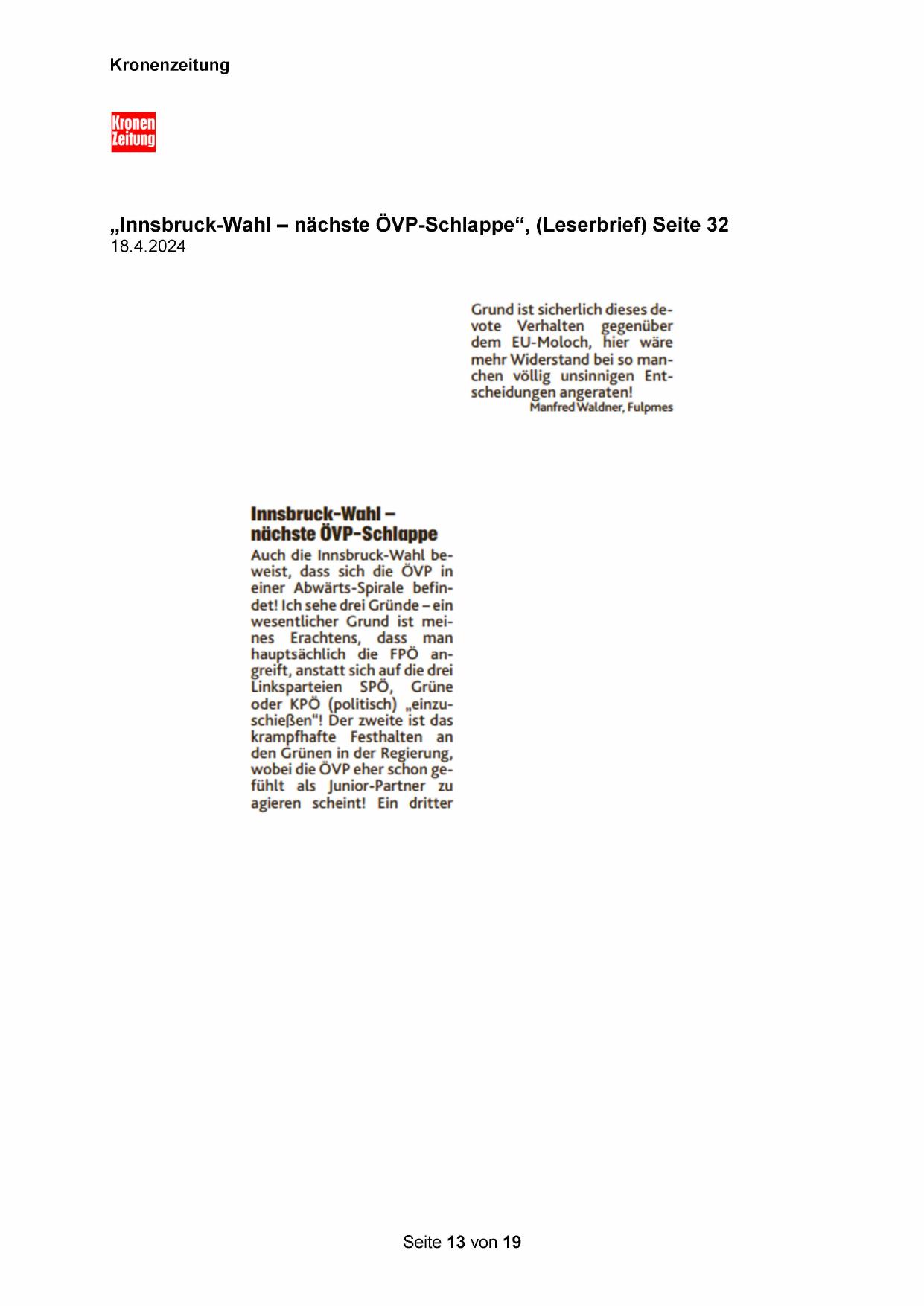 „Innsbruck-Wahl —- nächste ÖVP-Schlappe“, (Leserbrief) Seite 32