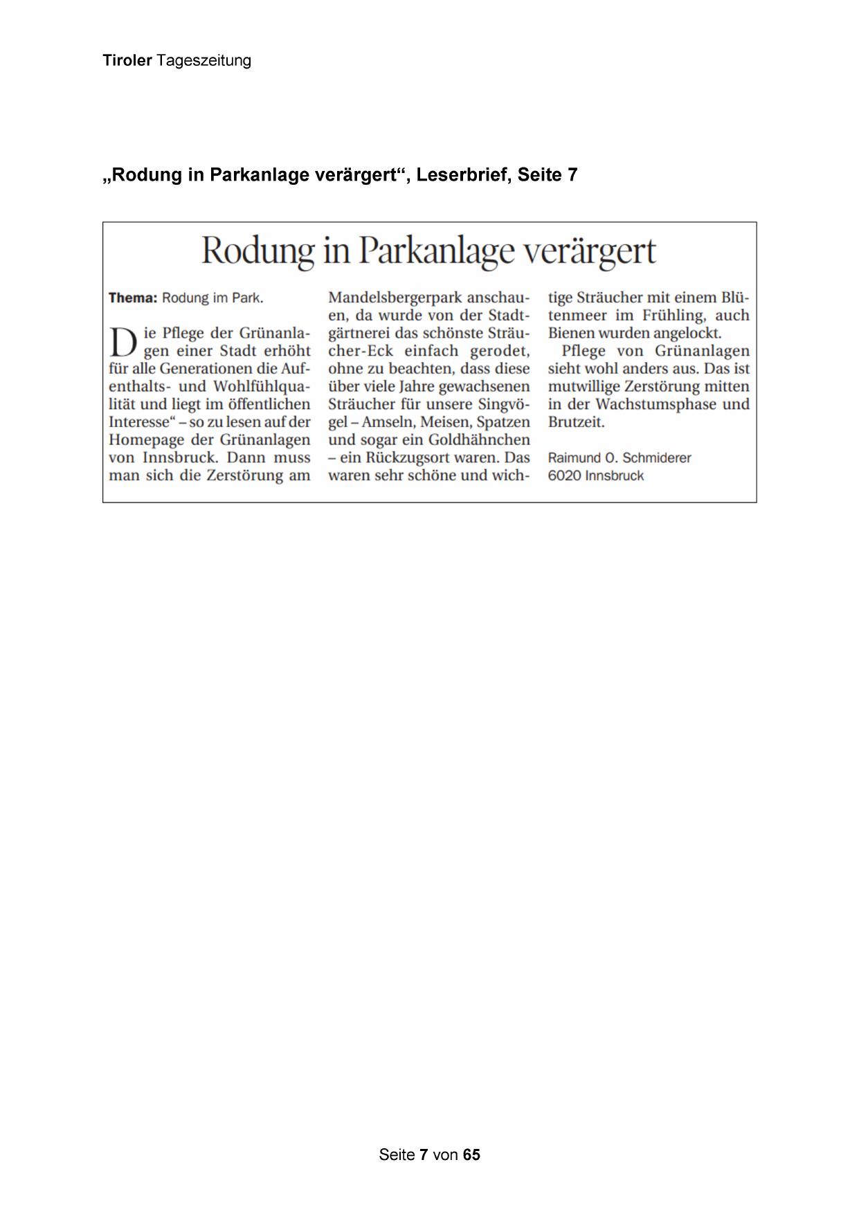 „Rodung in Parkanlage verärgert“, Leserbrief, Seite 7