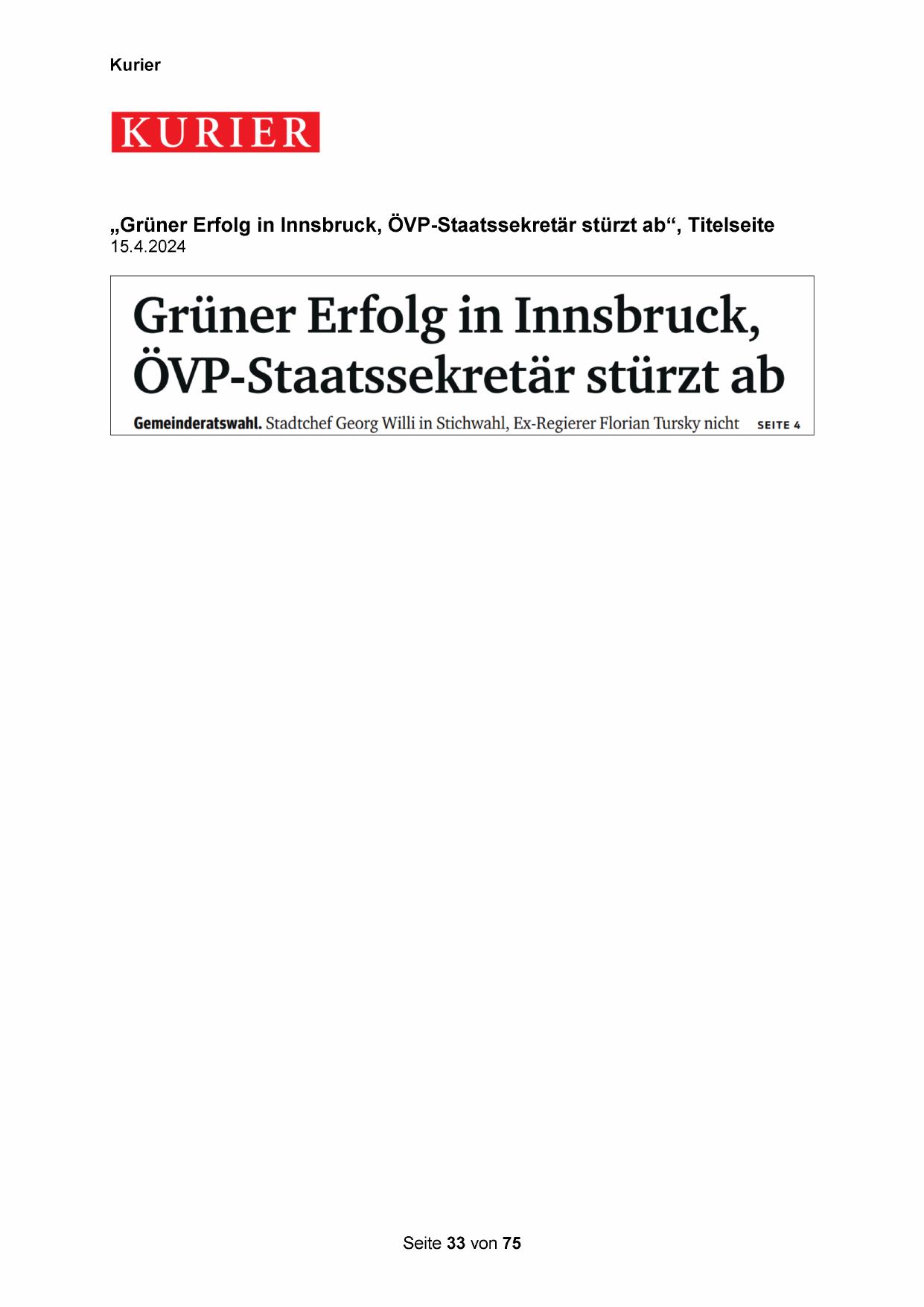 „Grüner Erfolg in Innsbruck, ÖVP-Staatssekretär stürzt ab“, Titelseite