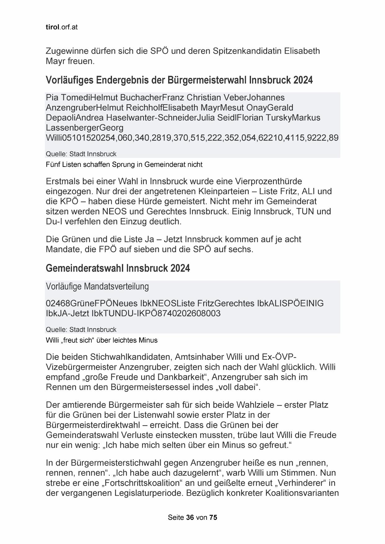 Vorläufiges Endergebnis der Bürgermeisterwahl Innsbruck 2024