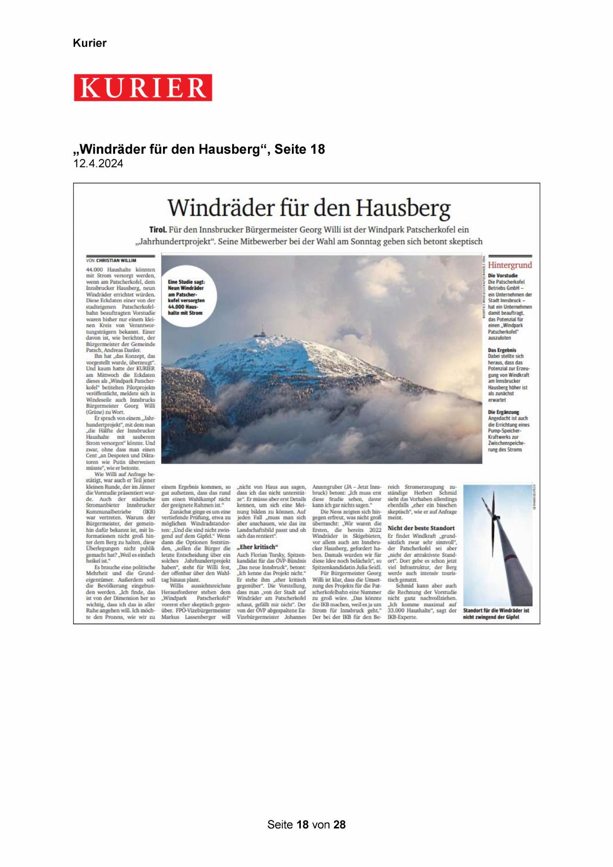 Tirol. Für den Innsbrucker Bürgermeister Georg Willi ist der Windpark Patscherkofel ein