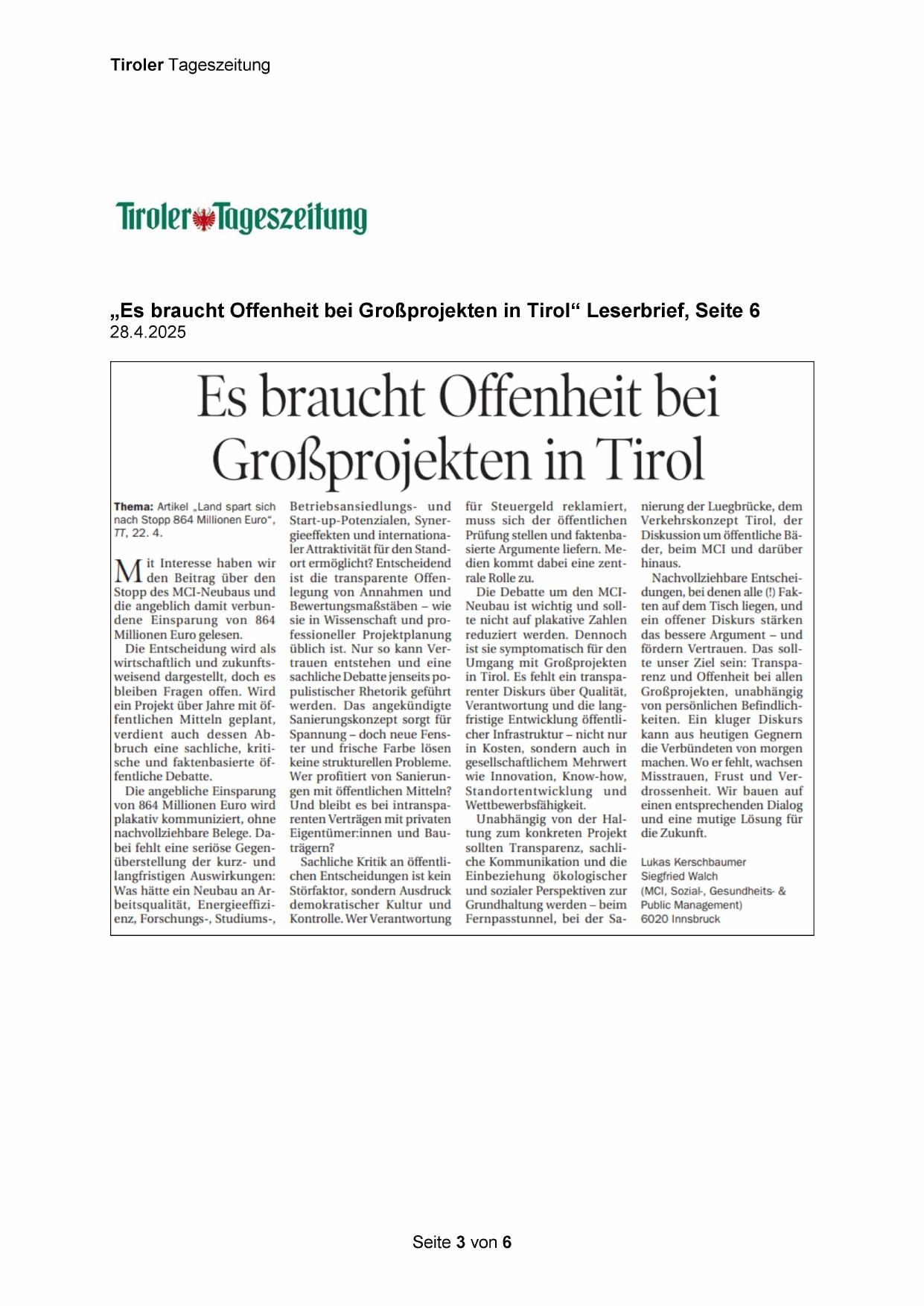 „Es braucht Offenheit bei Großprojekten in Tirol“ Leserbrief, Seite 6