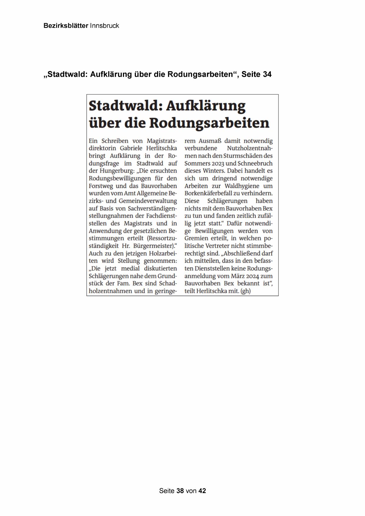 Auch zu den jetzigen Holzarbeiten wird Stellung genommen: