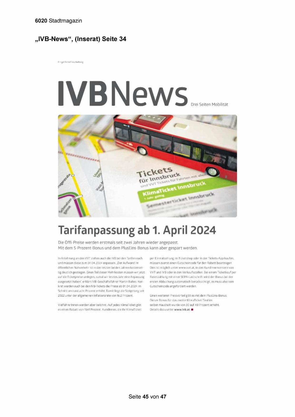 kret werden auch bei den IVB-Tıckets die Preise ab 01.04.2024 ım