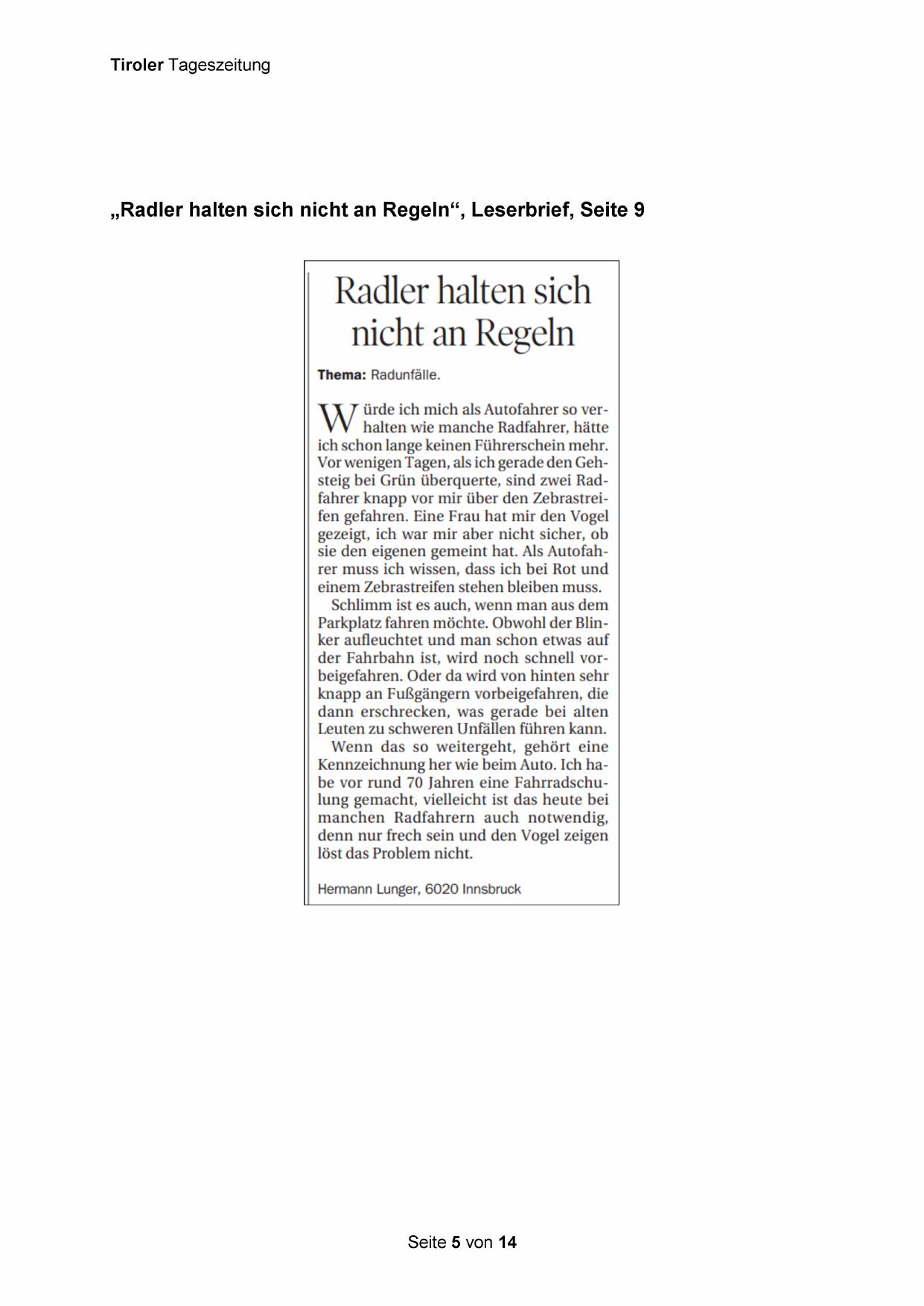 „Radler halten sich nicht an Regeln“, Leserbrief, Seite 9
