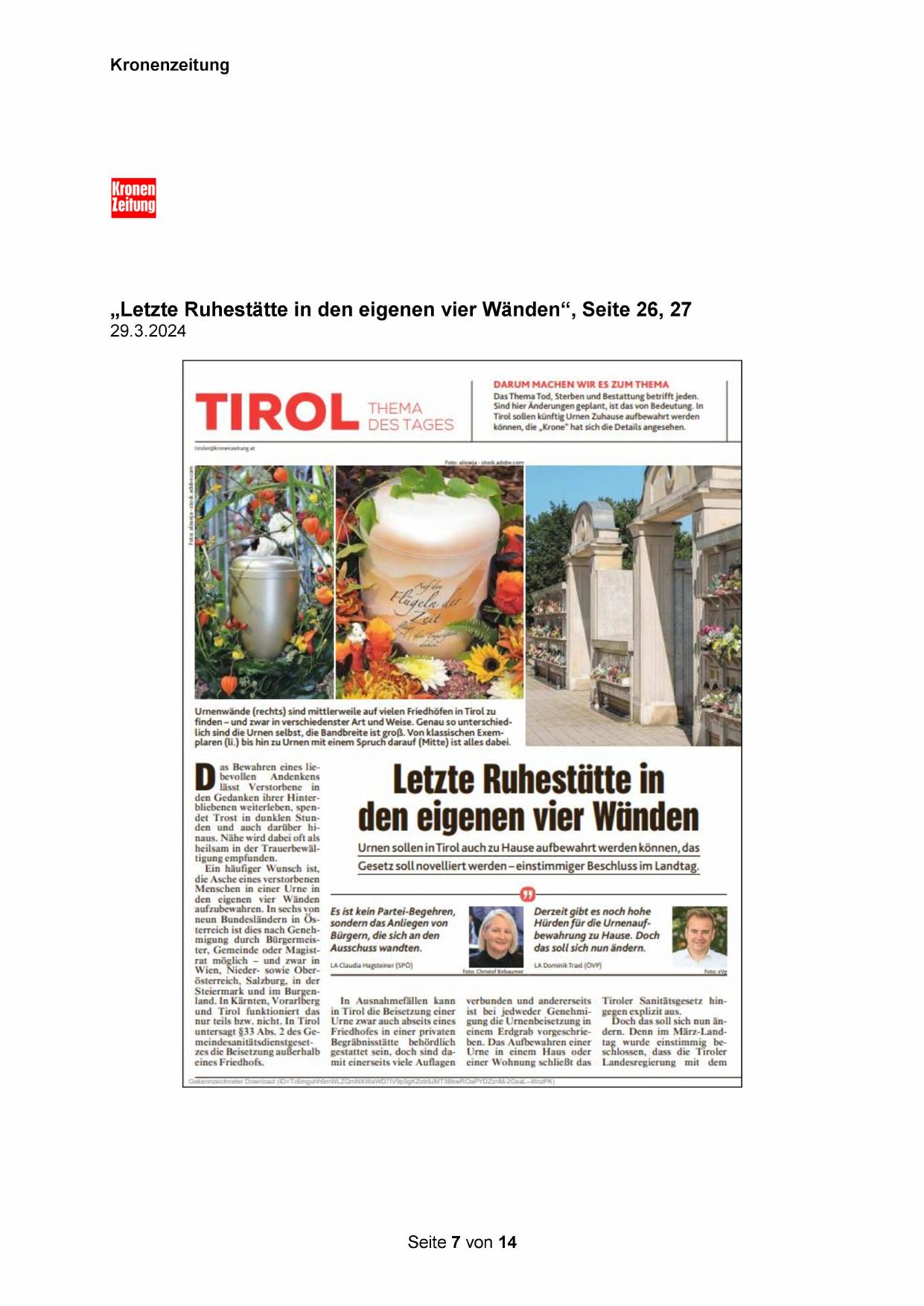 Tirol sollen künftig Urnen Zuhause aufbewahrt werden