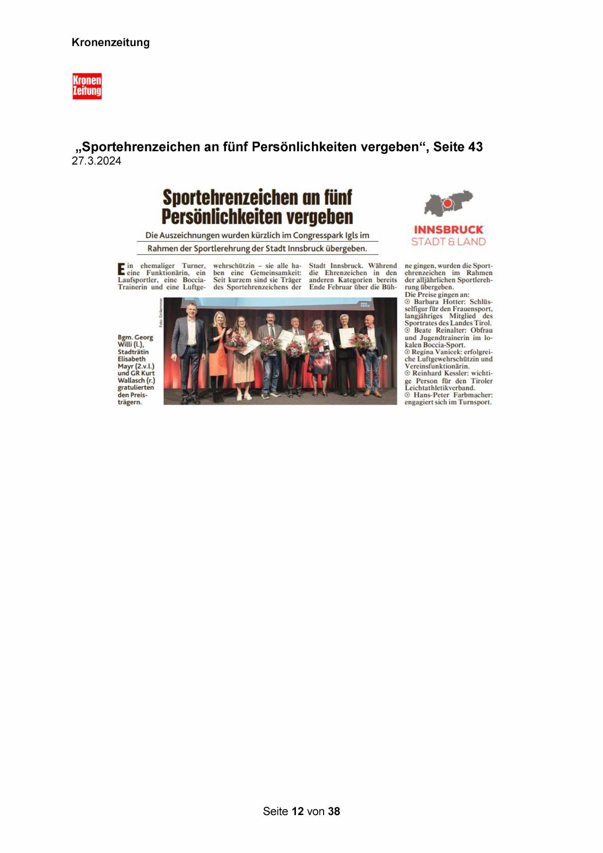 Rahmen der Sportlerehrung der Stadt Innsbruck übergeben.