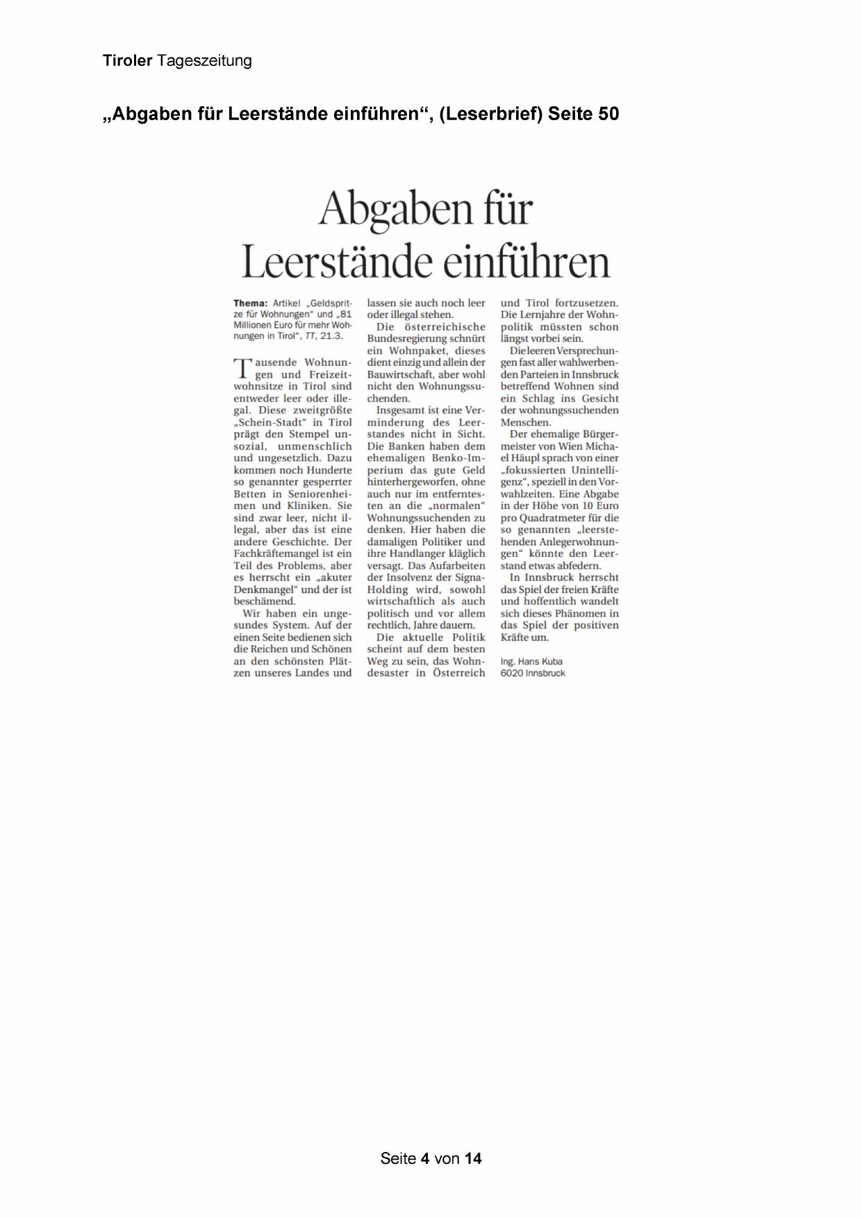 „Abgaben für Leerstände einführen“, (Leserbrief) Seite 50